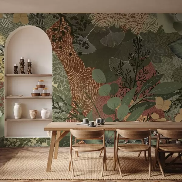 Stenske poslikave Abstraktna teksturirana kolaža botaničnih elementov z listi, cvetovi in organskimi teksturami v odtenkih zelene in rjave barve Št. w09545