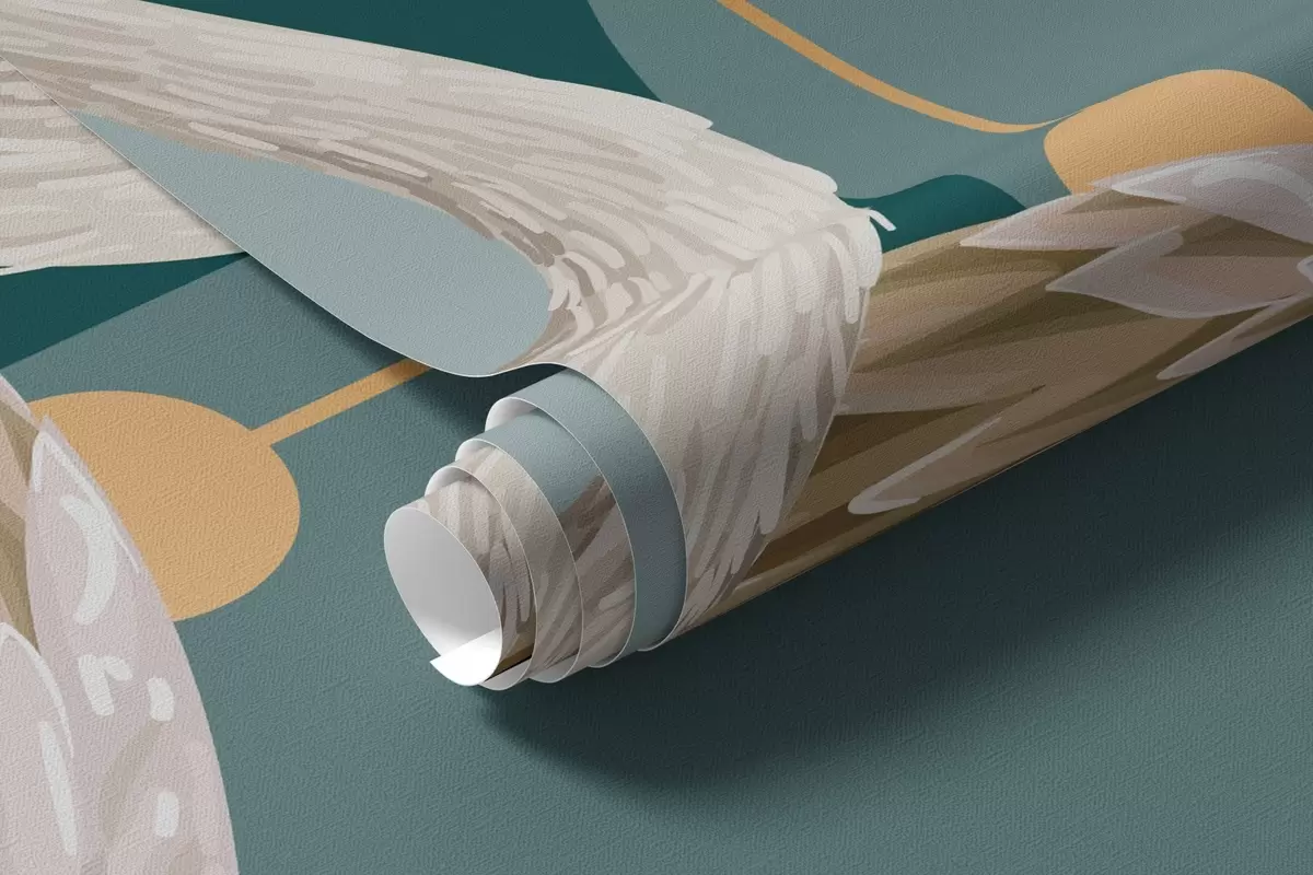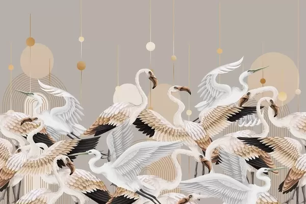 Stenske poslikave Jata belih plamencev z nežnimi krili na temno modrozelenem ozadju z rumenimi črtami in krogi Št. w09546