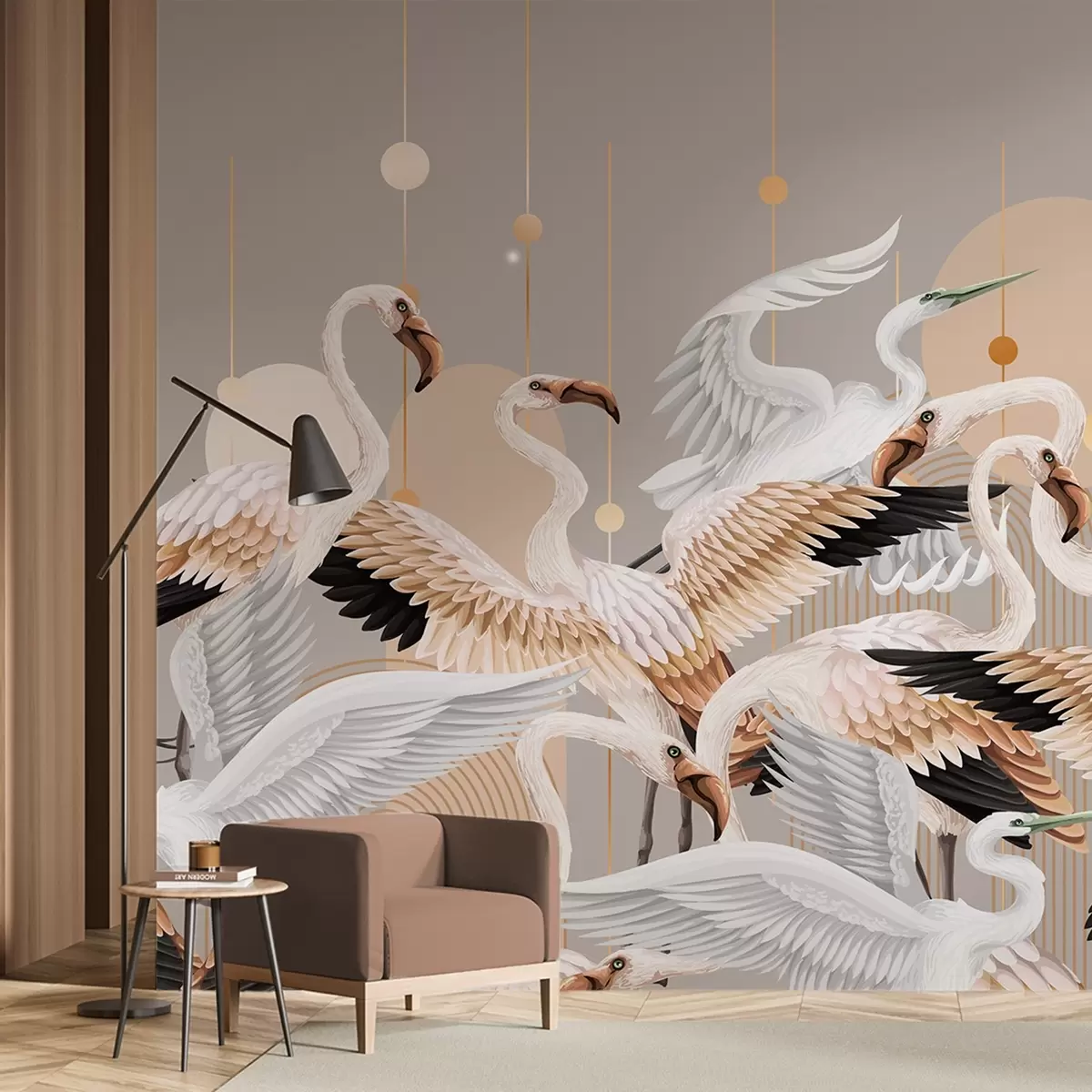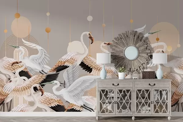 Stenske poslikave Jata belih plamencev z nežnimi krili na nevtralnem ozadju z rumenimi črtami in krogi Št. w09546v1