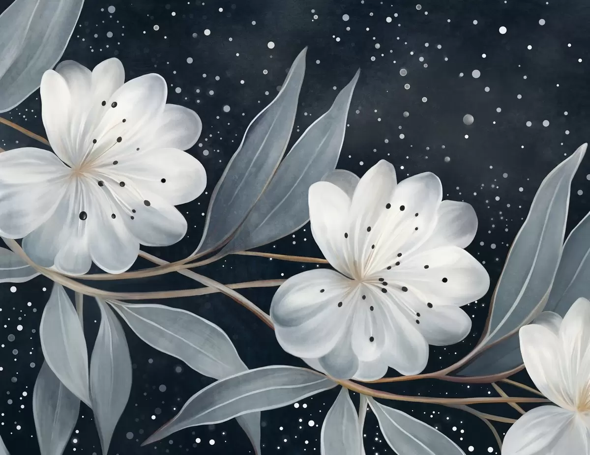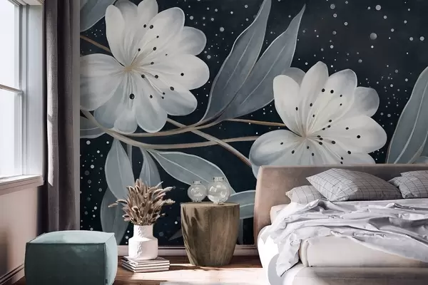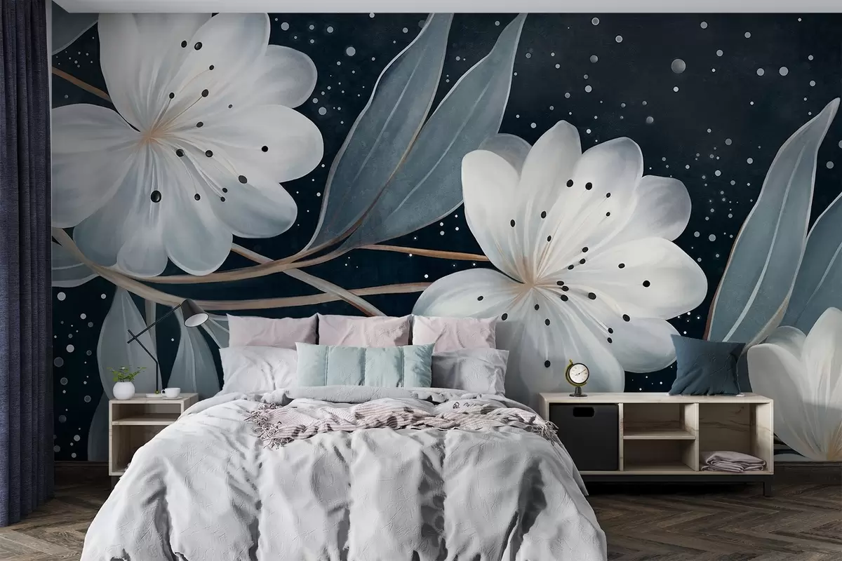 Stenske poslikave Fantazijski teksturirani beli cvetovi, obdani z modro-zelenimi listi in vejami na temnem ozadju Št. w09551