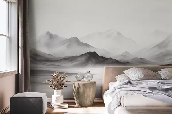 Stenske poslikave Enobarvna teksturirana pokrajina z meglenimi gorami in jezerom v ospredju Št. w09555