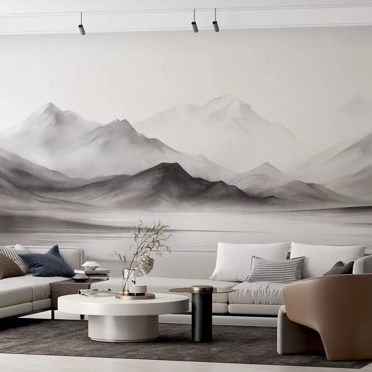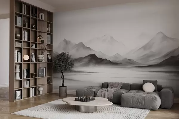 Stenske poslikave Enobarvna teksturirana pokrajina z meglenimi gorami in jezerom v ospredju Št. w09555