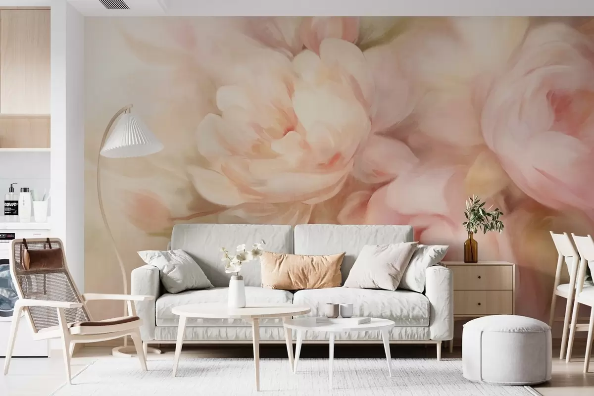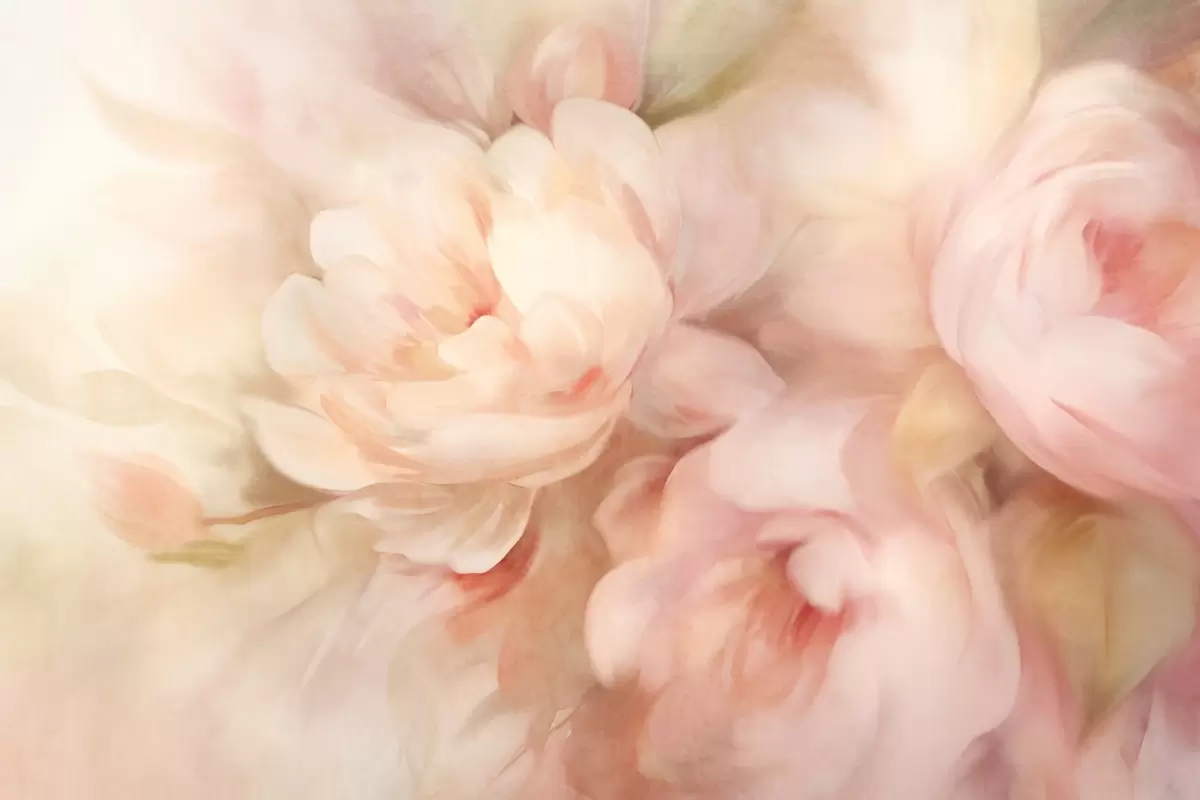 Stenske poslikave Zamegljene bledo rožnate in kremaste potonike z mehkimi, slikarskimi potezami čopiča, ki ustvarjajo teksturirano cvetno aranžma. Št. w09556
