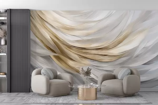 Stenske poslikave Abstraktno teksturirana bela, siva in rumena peresa, ki ustvarjajo tekoč, večplastni vzorec na svetlem ozadju Št. w09557