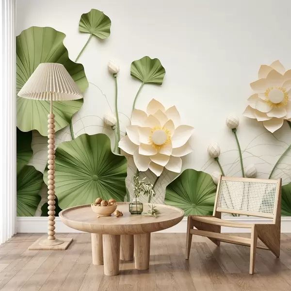 Stenske poslikave 3D lotusovi cvetovi z zelenimi teksturiranimi listi, minimalistični slog Št. w09560