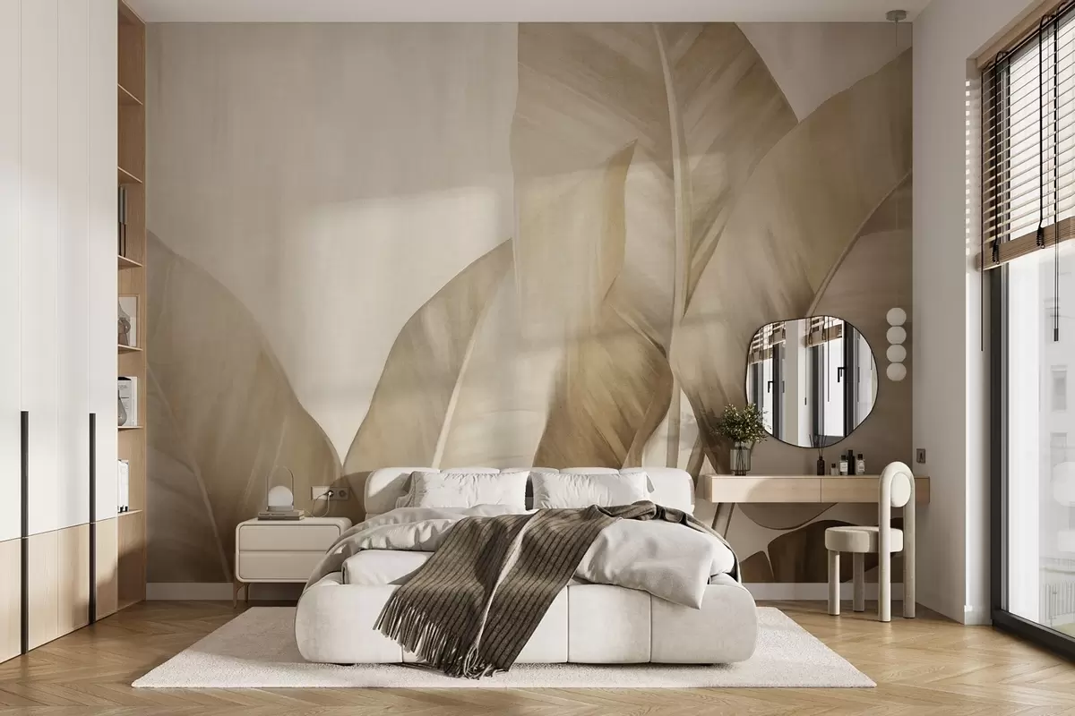 Stenske poslikave Teksturirani veliki, svetlo rjavi bananini listi na svetlo bežnem ozadju, z mehko in minimalistično estetiko. Št. w09586