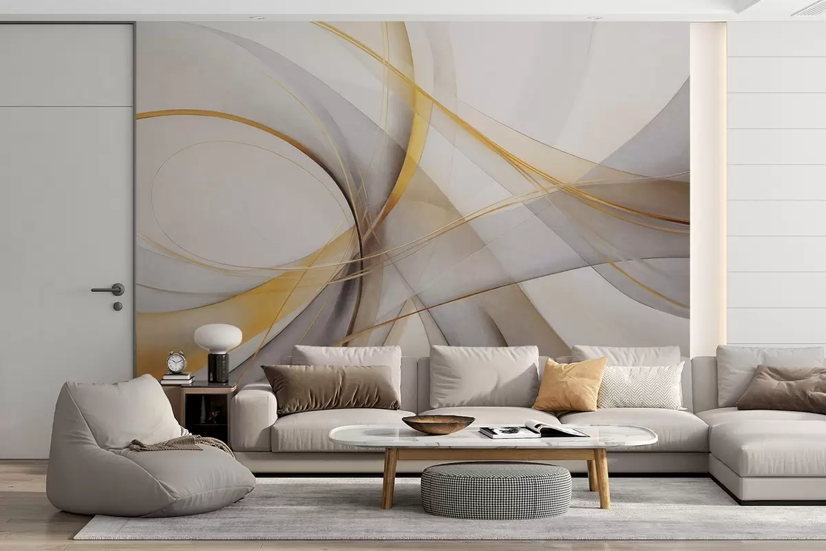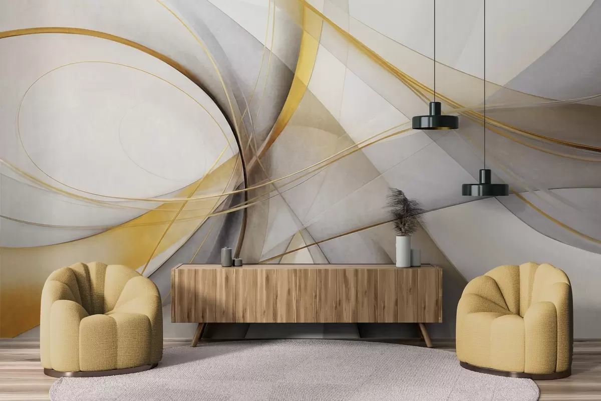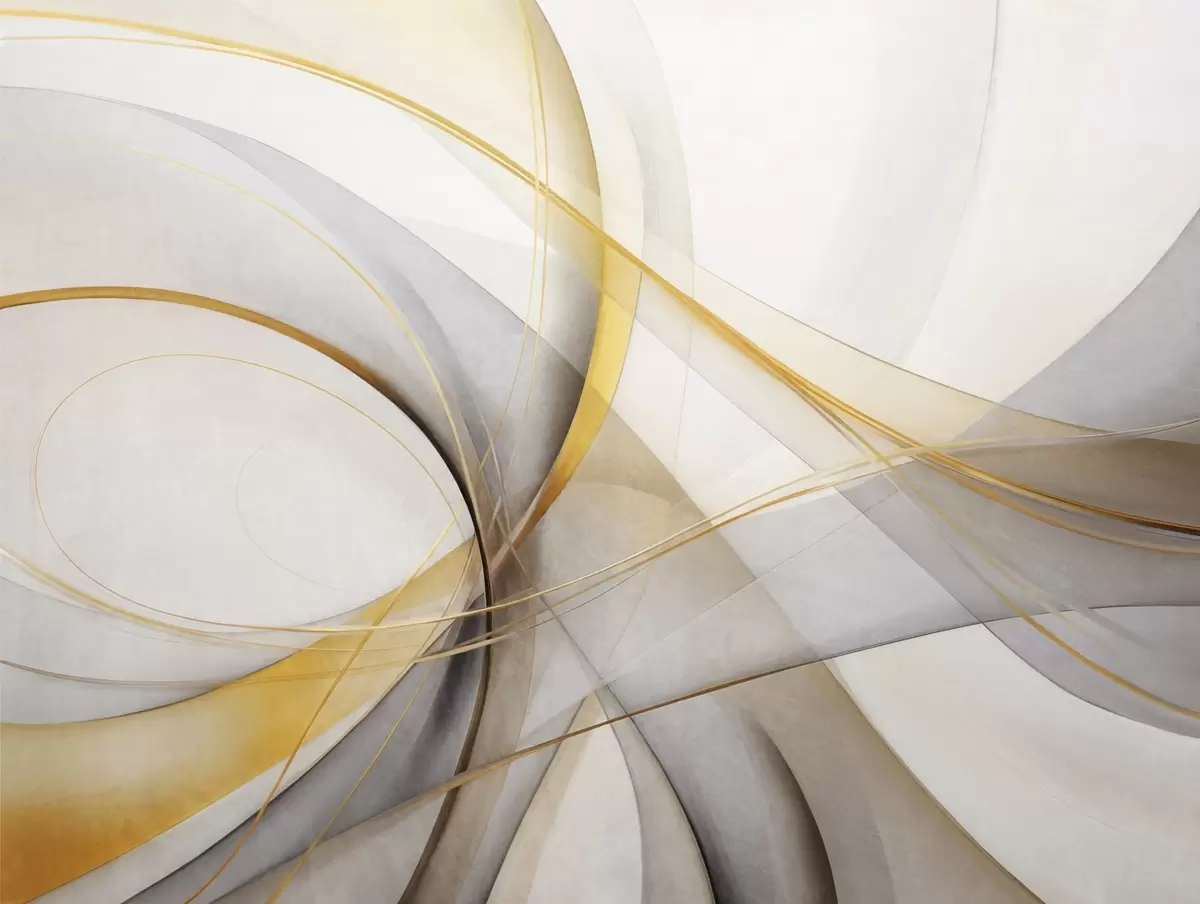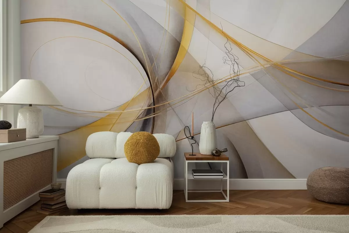 Stenske poslikave Abstraktne tekoče črte v rumeni in beli barvi na sivem ozadju, ki dajejo občutek gibanja in globine, sodobna umetnost Št. w09587