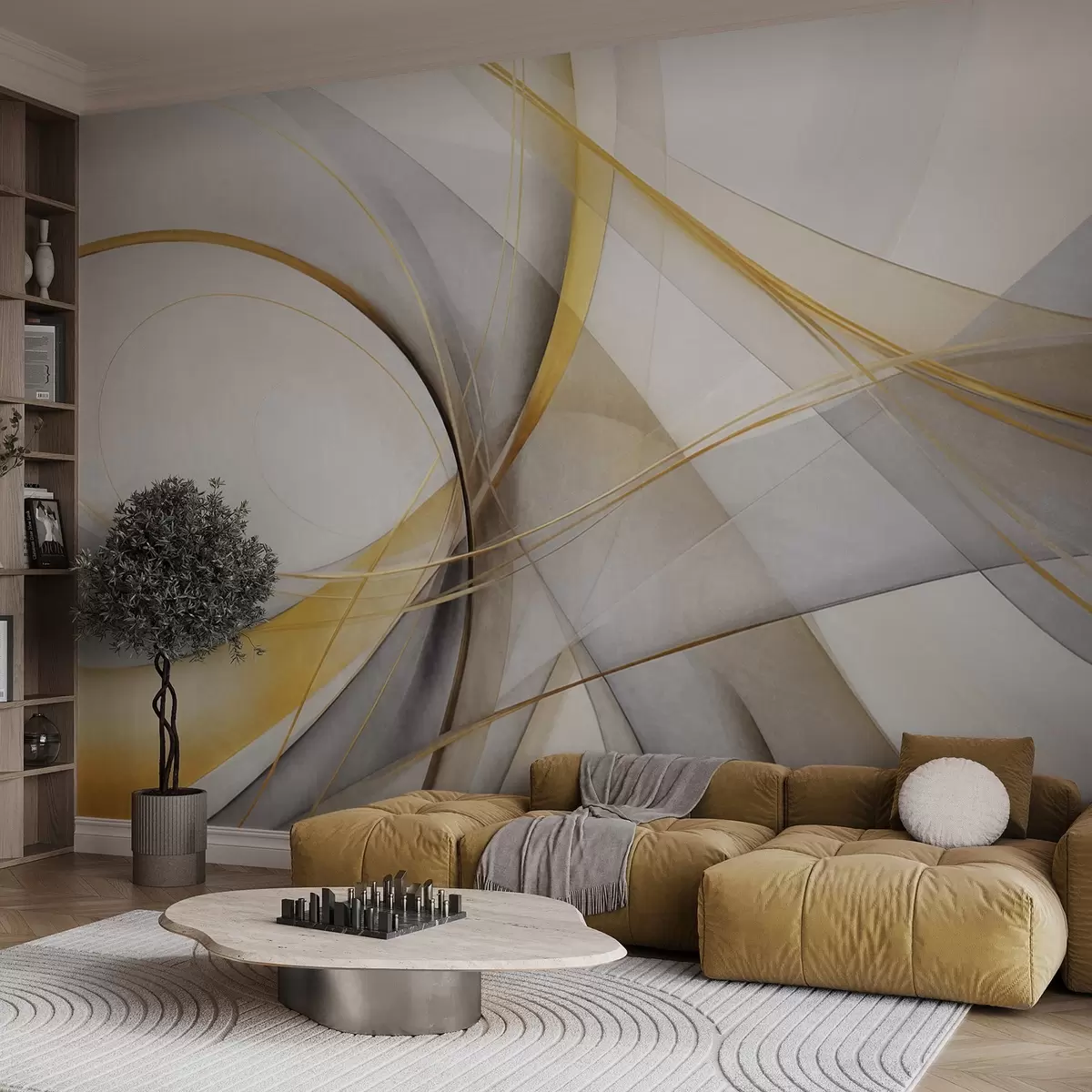 Stenske poslikave Abstraktne tekoče črte v rumeni in beli barvi na sivem ozadju, ki dajejo občutek gibanja in globine, sodobna umetnost Št. w09587