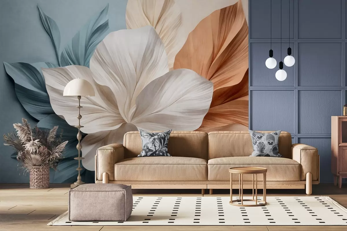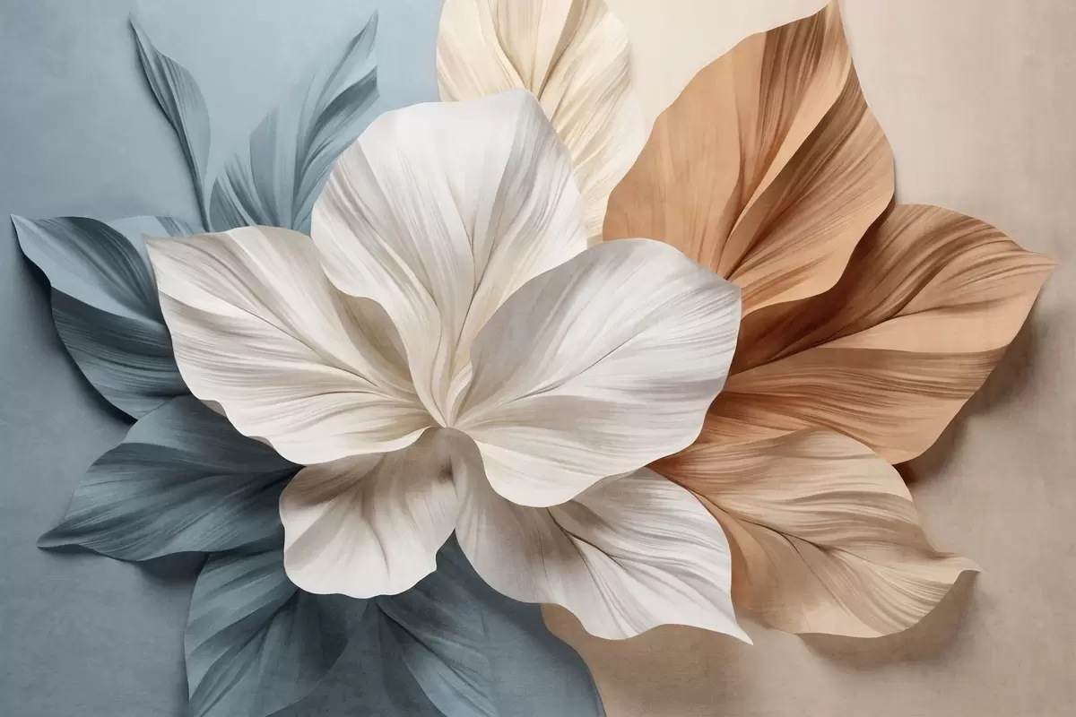 Stenske poslikave Abstraktni cvet z več cvetnimi listi in teksturiranimi listi v odtenkih breskve in modre barve, mehko ozadje Št. w09604