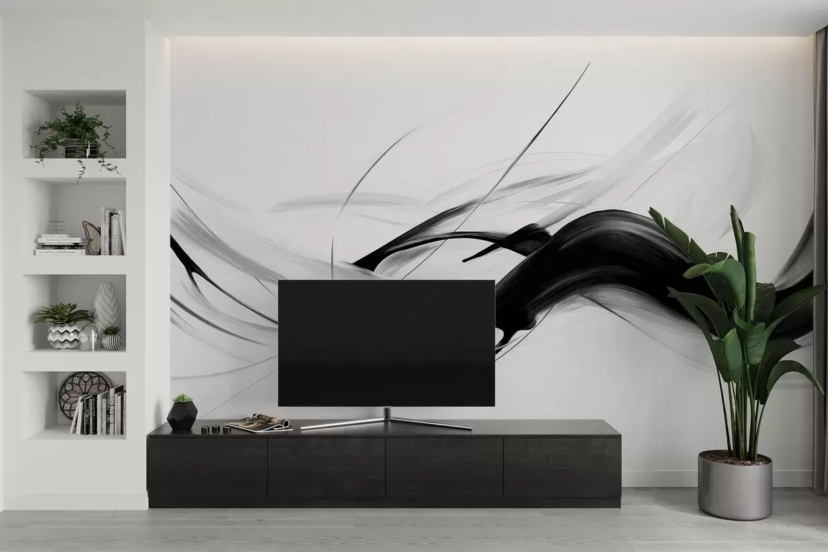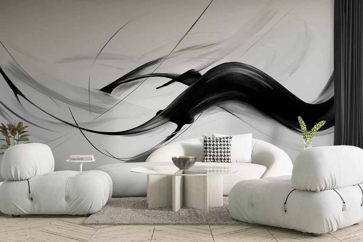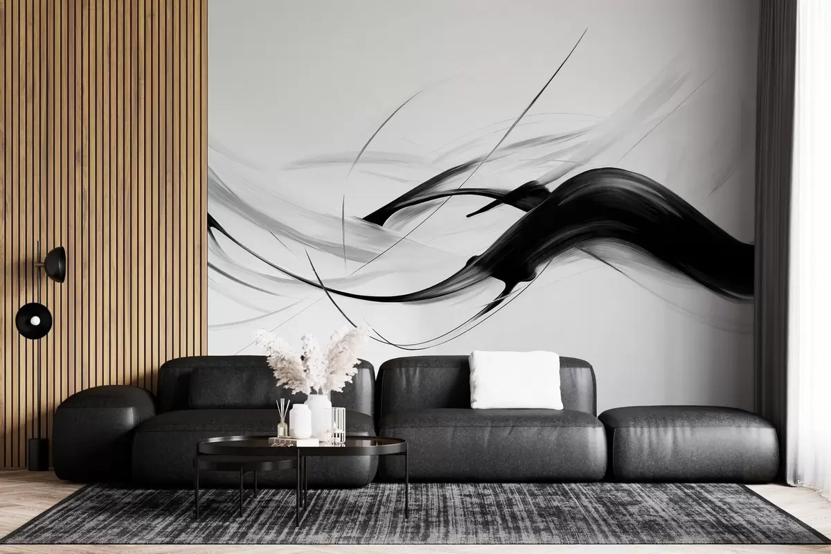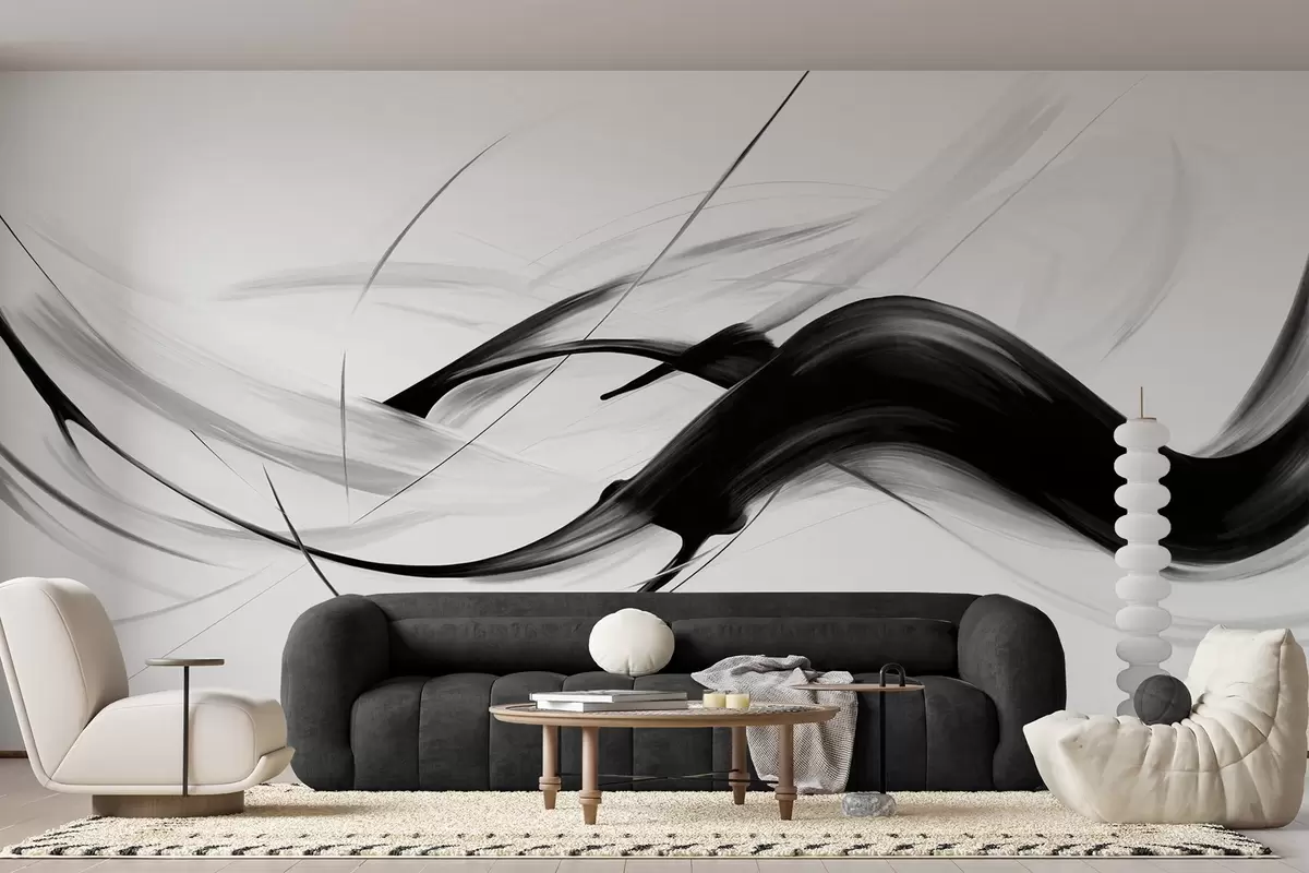 Stenske poslikave Abstraktni črno-beli čopični potegi s tankimi črtami ustvarjajo sodoben dizajn na svetlem ozadju. Št. w09605