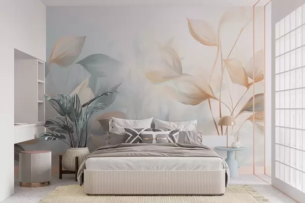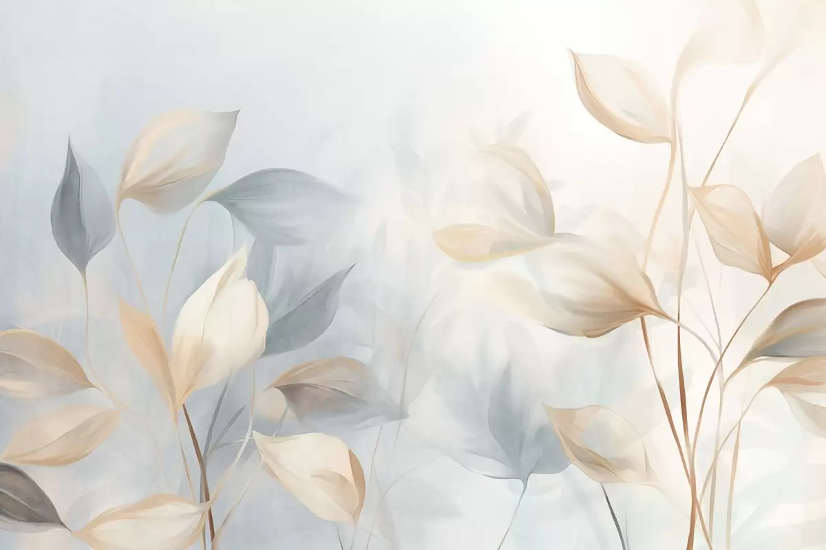 Stenske poslikave Mehka, nežna, prosojna listja v umirjenih odtenkih bež, breskve in bledo modre barve, teksturirana pastelna umetnost Št. w09607