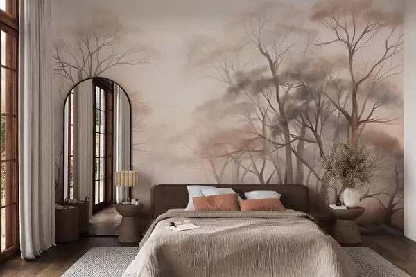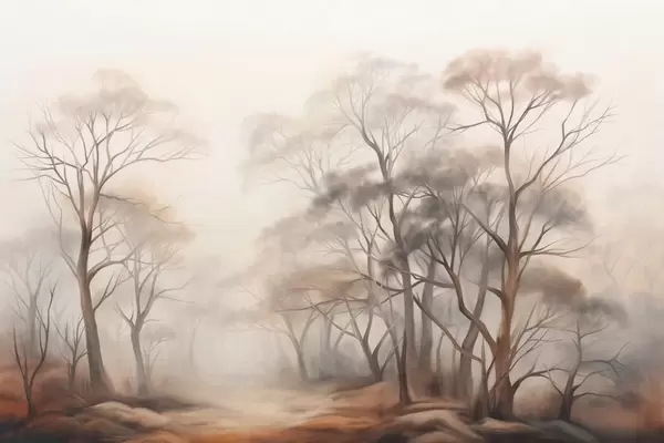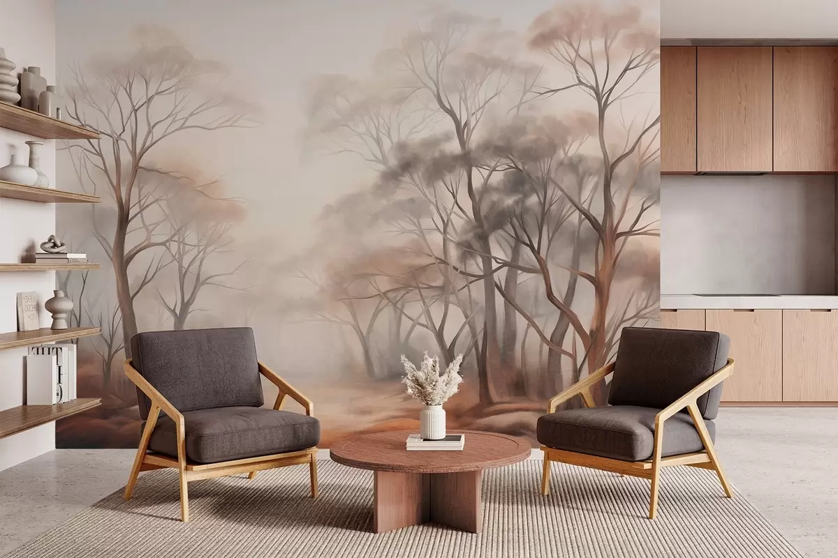 Stenske poslikave Teksturirana drevesa v zamegljenem gozdu, meglena pokrajina z umirjenimi, pridušenimi barvami in nežno osvetlitvijo Št. w09609