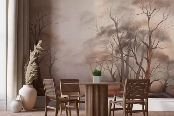 Stenske poslikave Teksturirana drevesa v zamegljenem gozdu, meglena pokrajina z umirjenimi, pridušenimi barvami in nežno osvetlitvijo Št. w09609