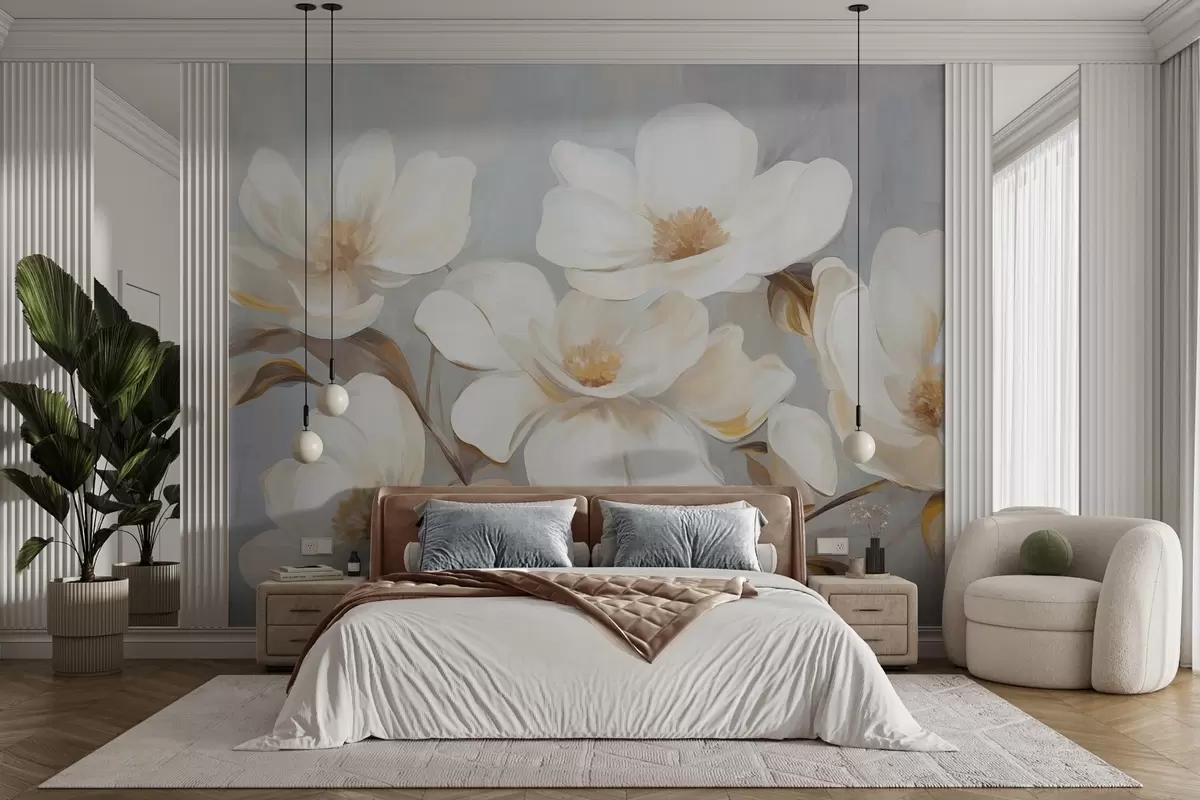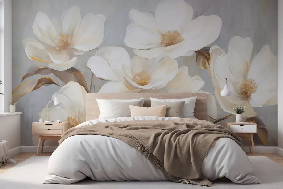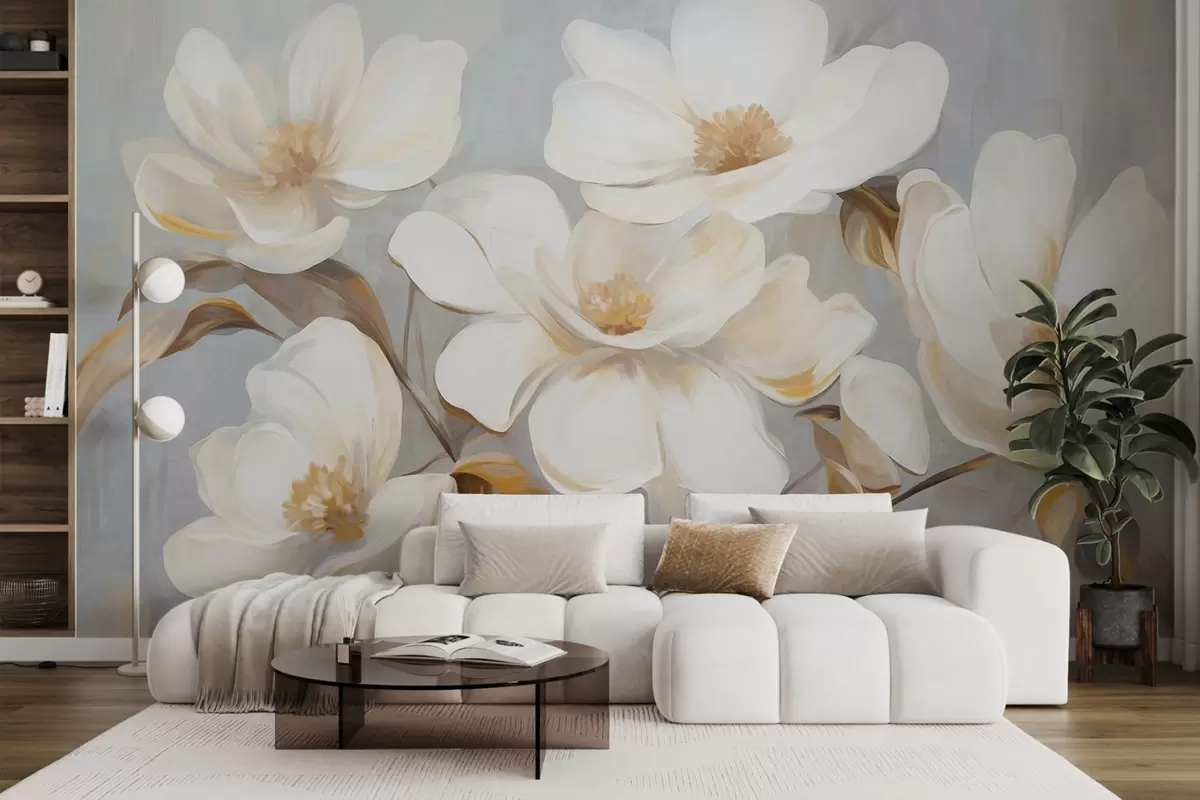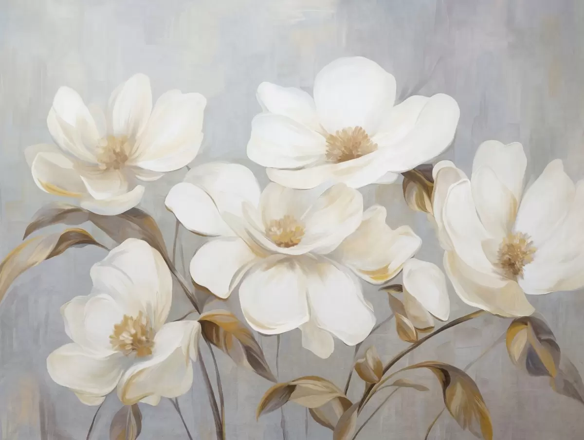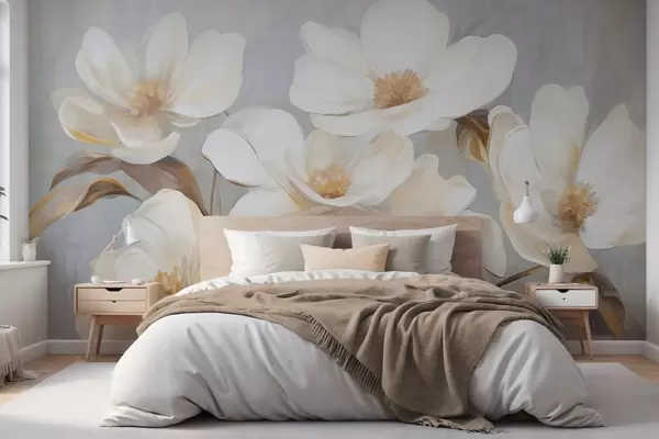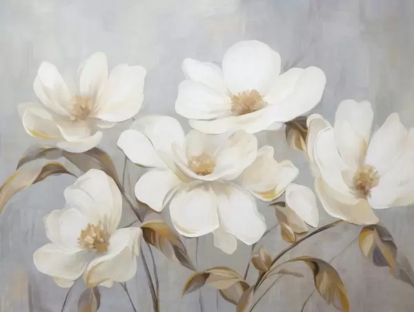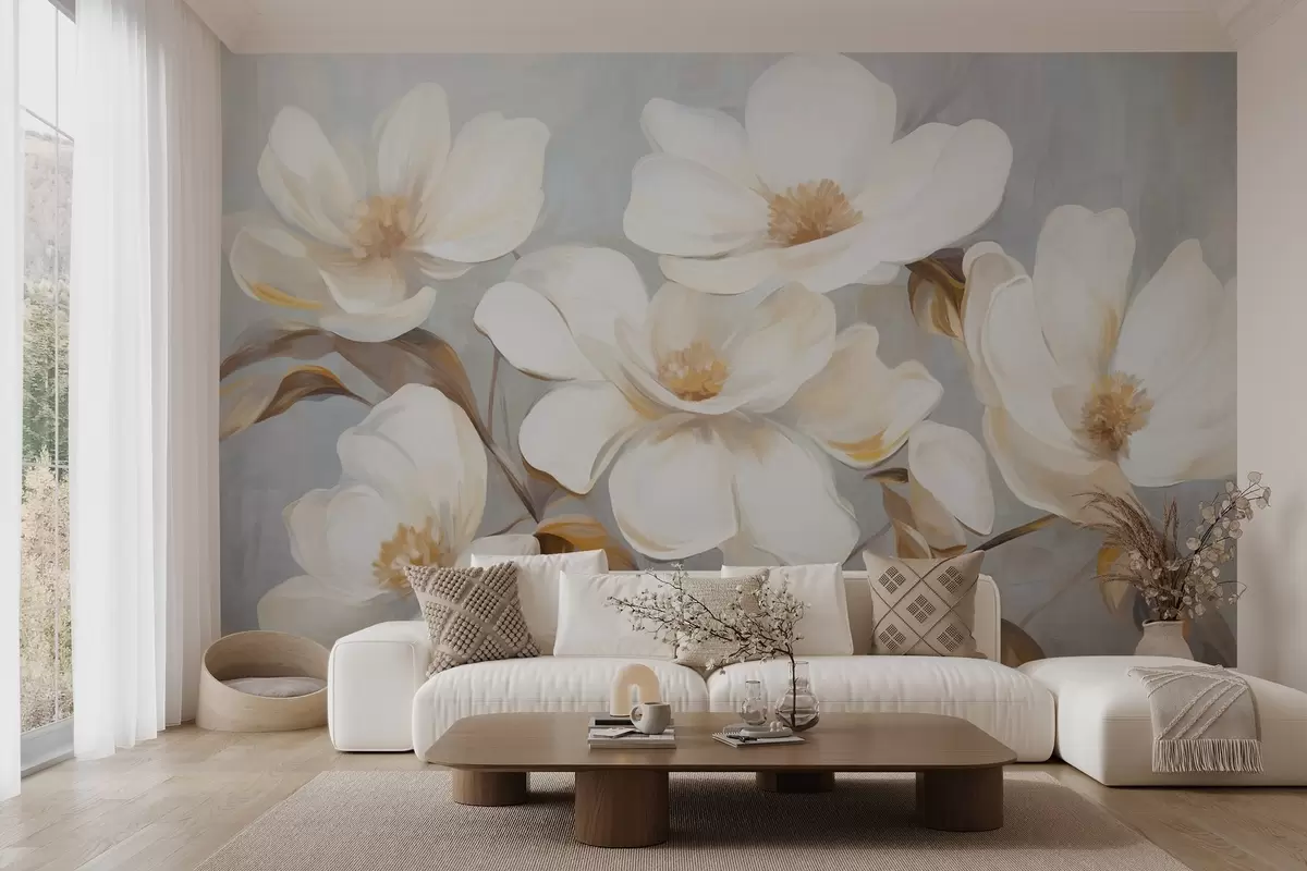 Stenske poslikave Teksturirana slika, ki posnema več belih magnolijevih cvetov na nevpadljivem pastelno obarvanem ozadju. Št. w09612