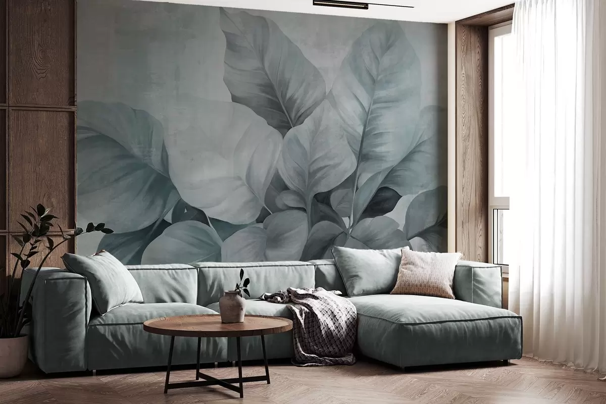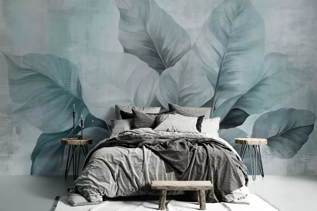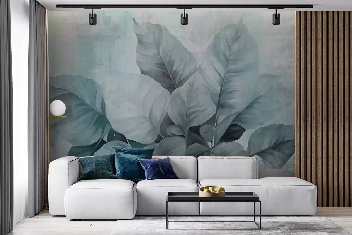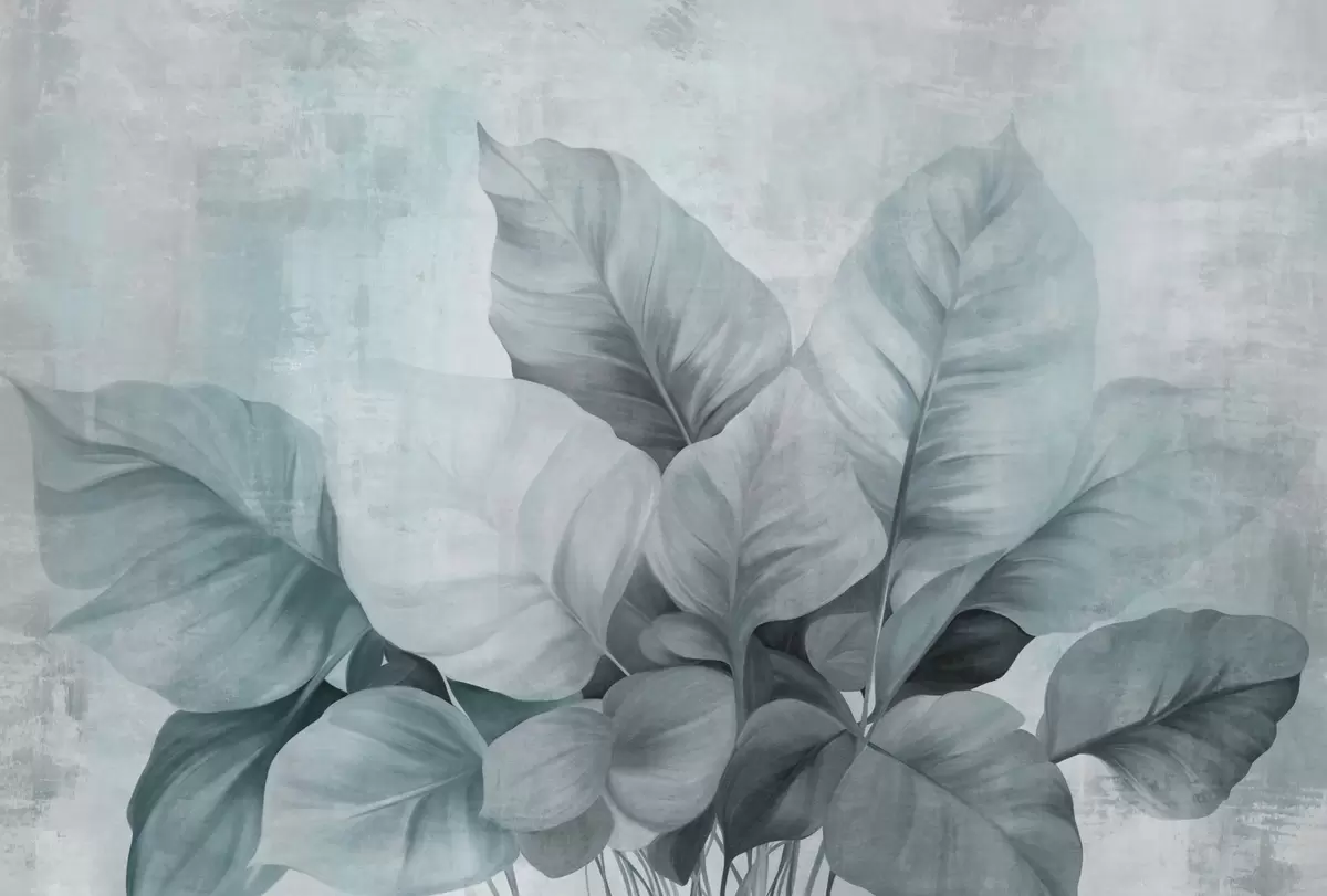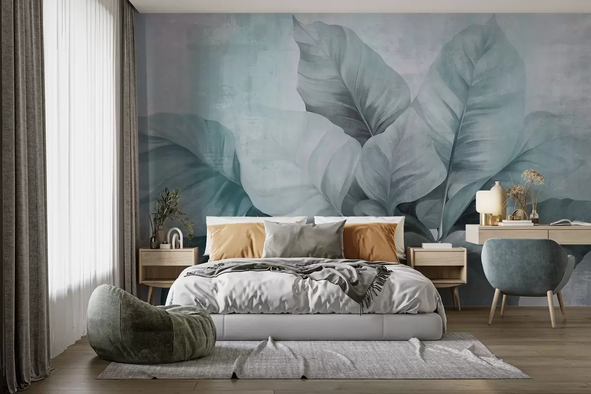 Stenske poslikave Teksturirana slika, ki posnema velike, svetlo modre liste na nevtralnem ozadju z nežnimi potezami čopiča. Št. w09614v2