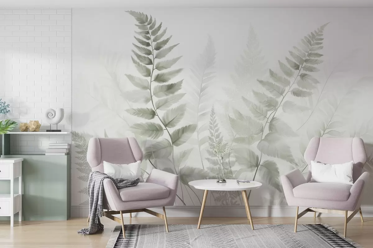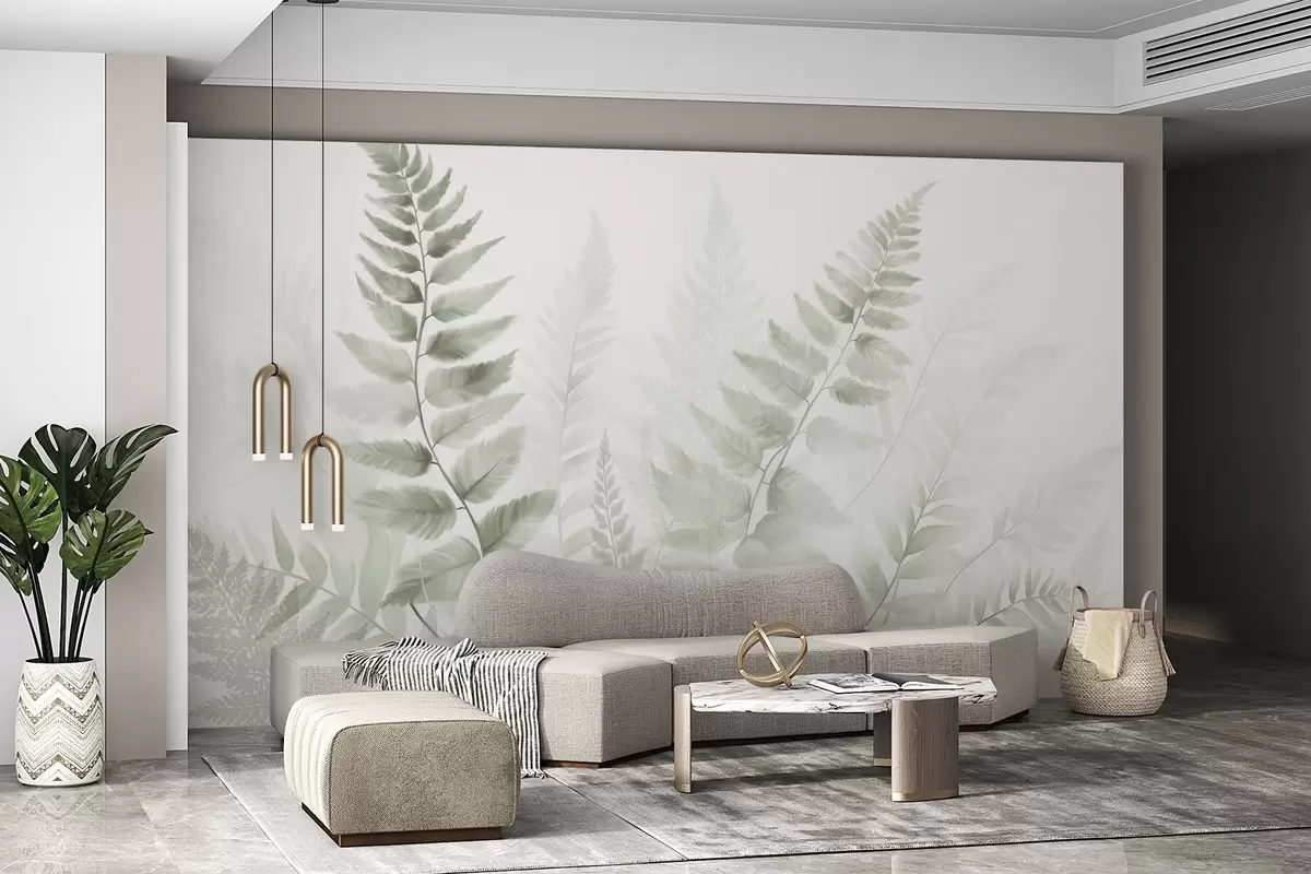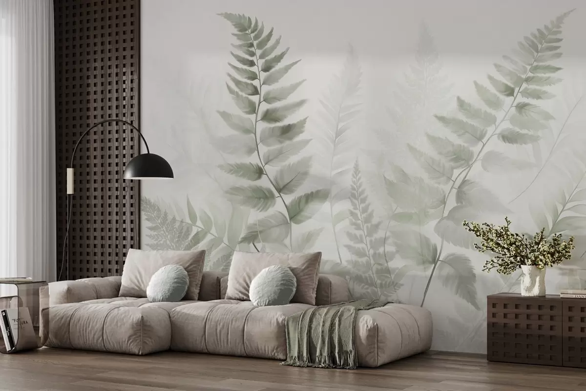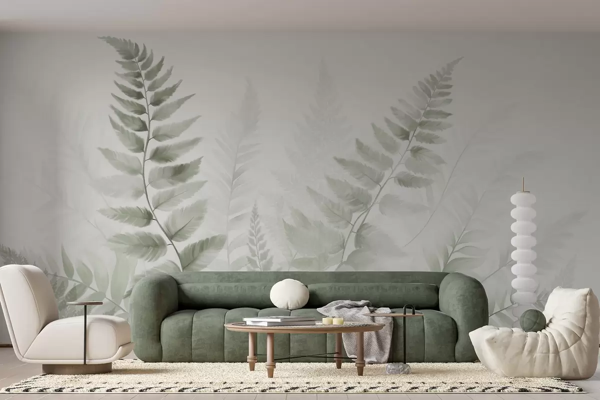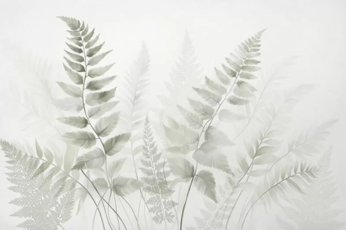 Stenske poslikave Teksturirani posušeni listi praproti v različnih odtenkih zelene barve, z mehkim, svetlim ozadjem v akvarelnem slogu. Št. w09615v1