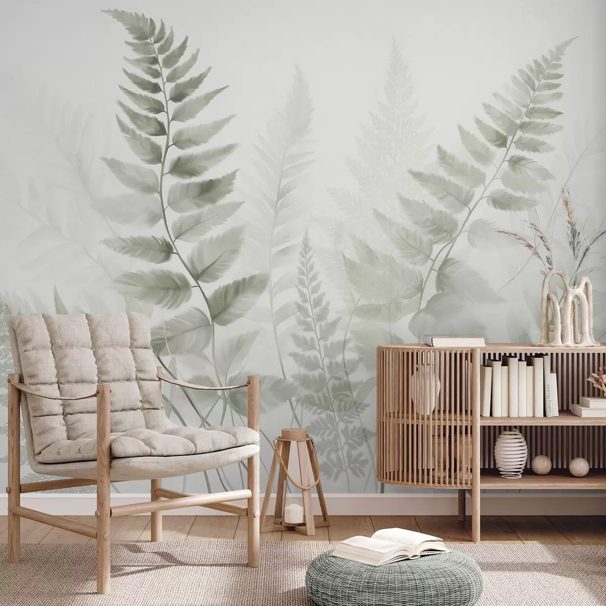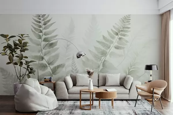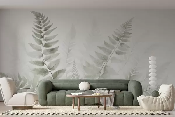 Stenske poslikave Teksturirani posušeni listi praproti v različnih odtenkih zelene barve, z mehkim, svetlim ozadjem v akvarelnem slogu. Št. w09615v1