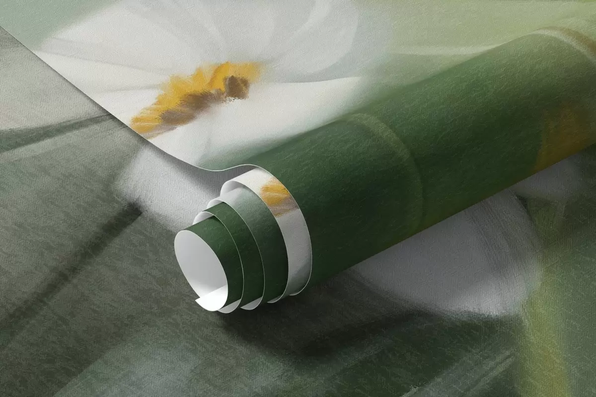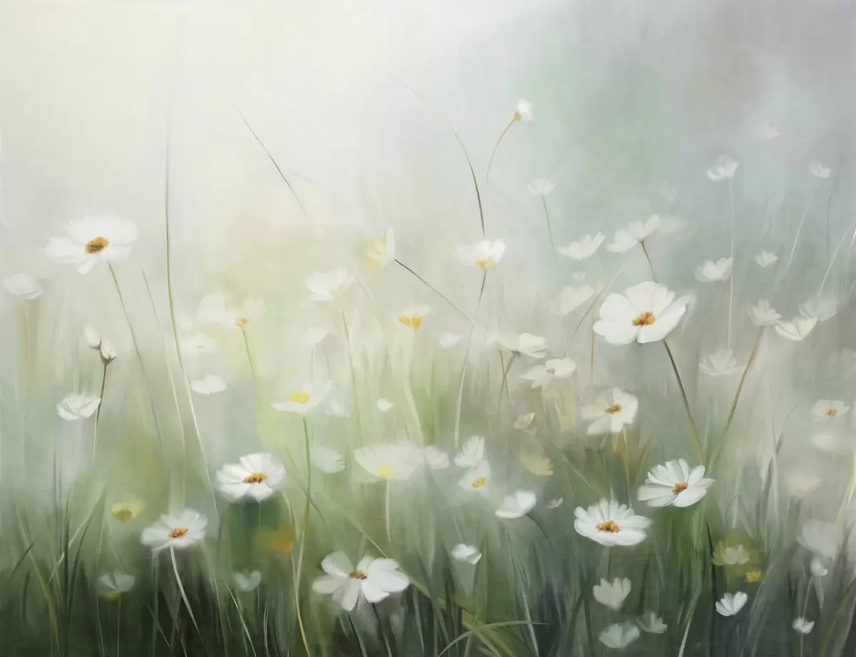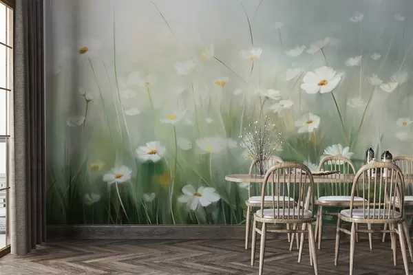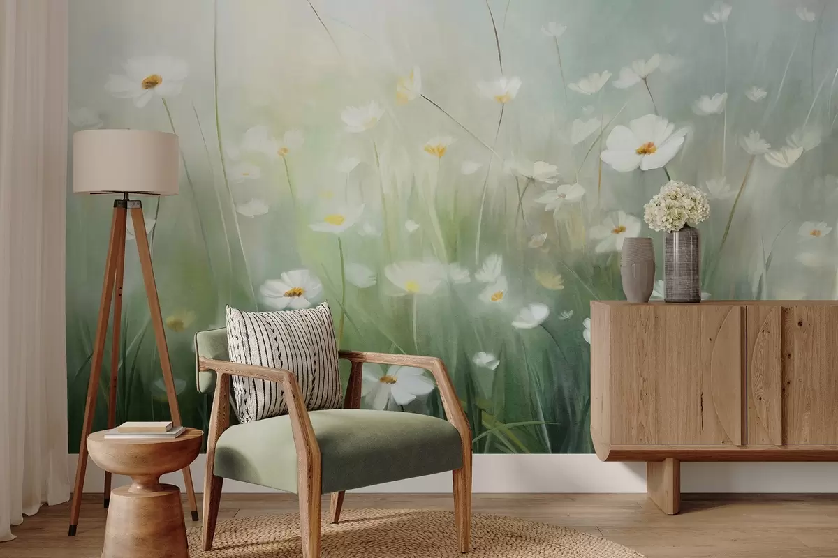 Stenske poslikave Abstraktno polje belih marjetic z zeleno travo in mehkim, zamegljenim ozadjem v slikarskem slogu Št. w09619