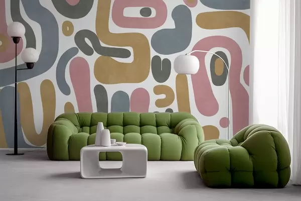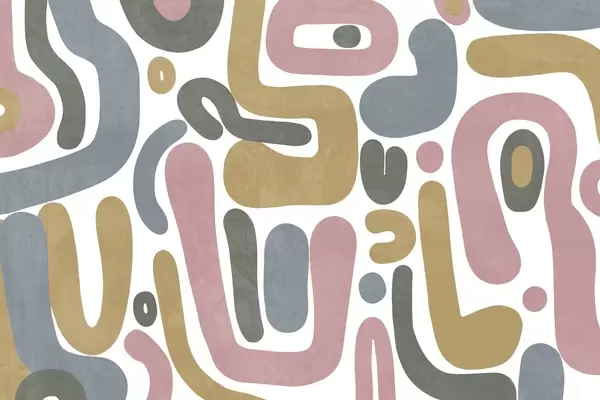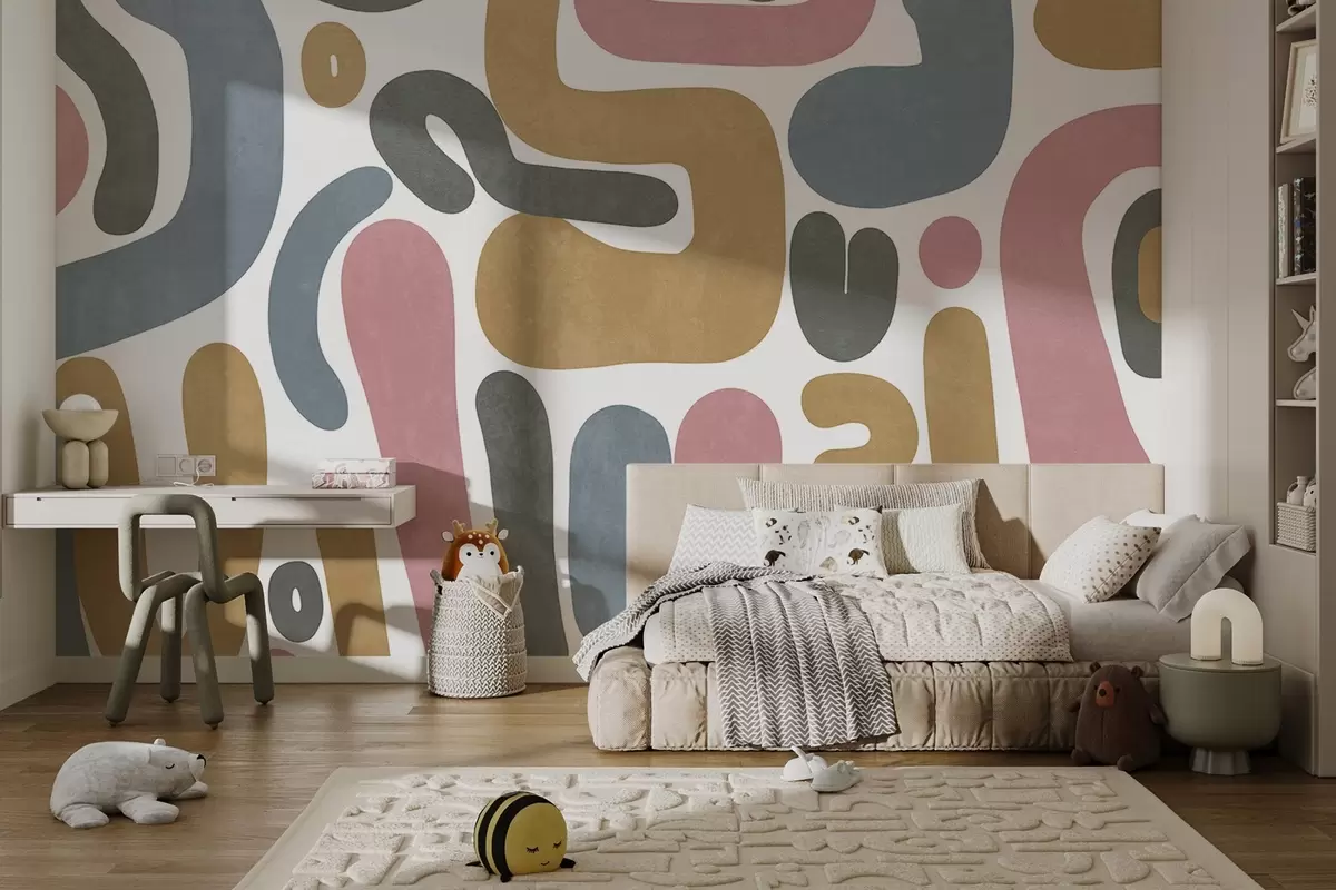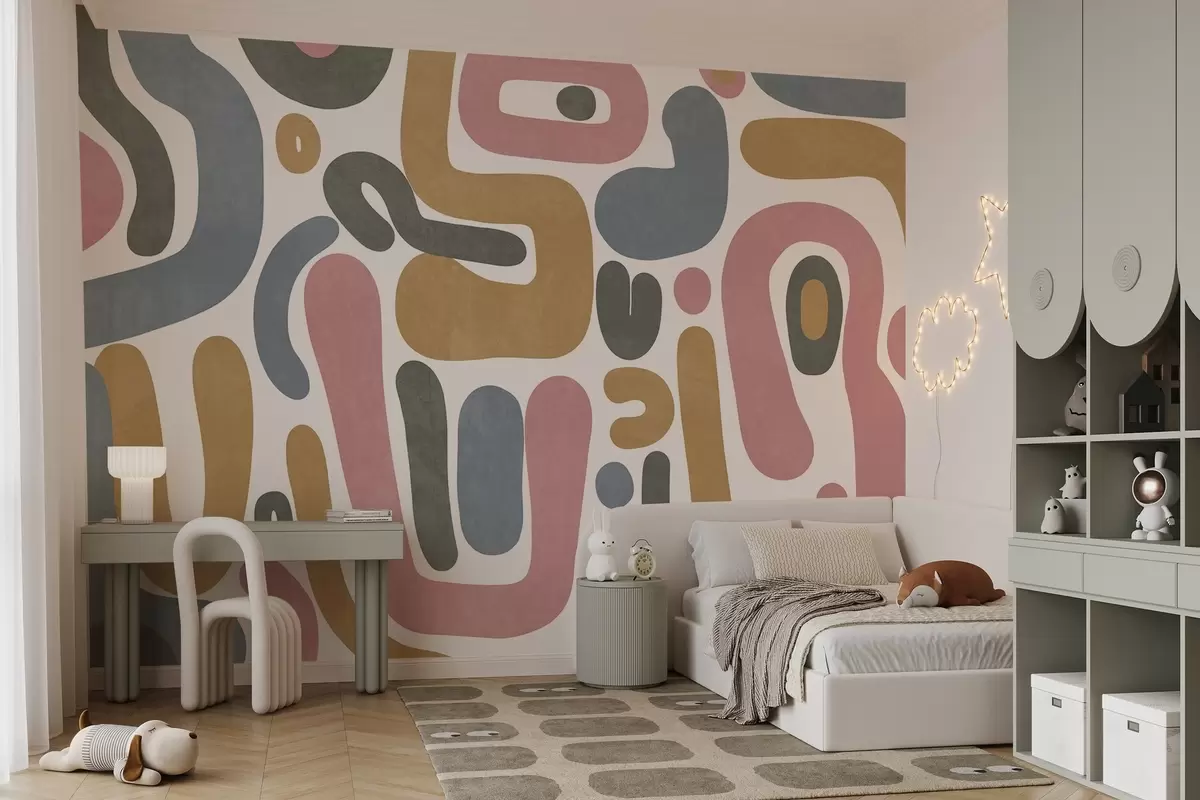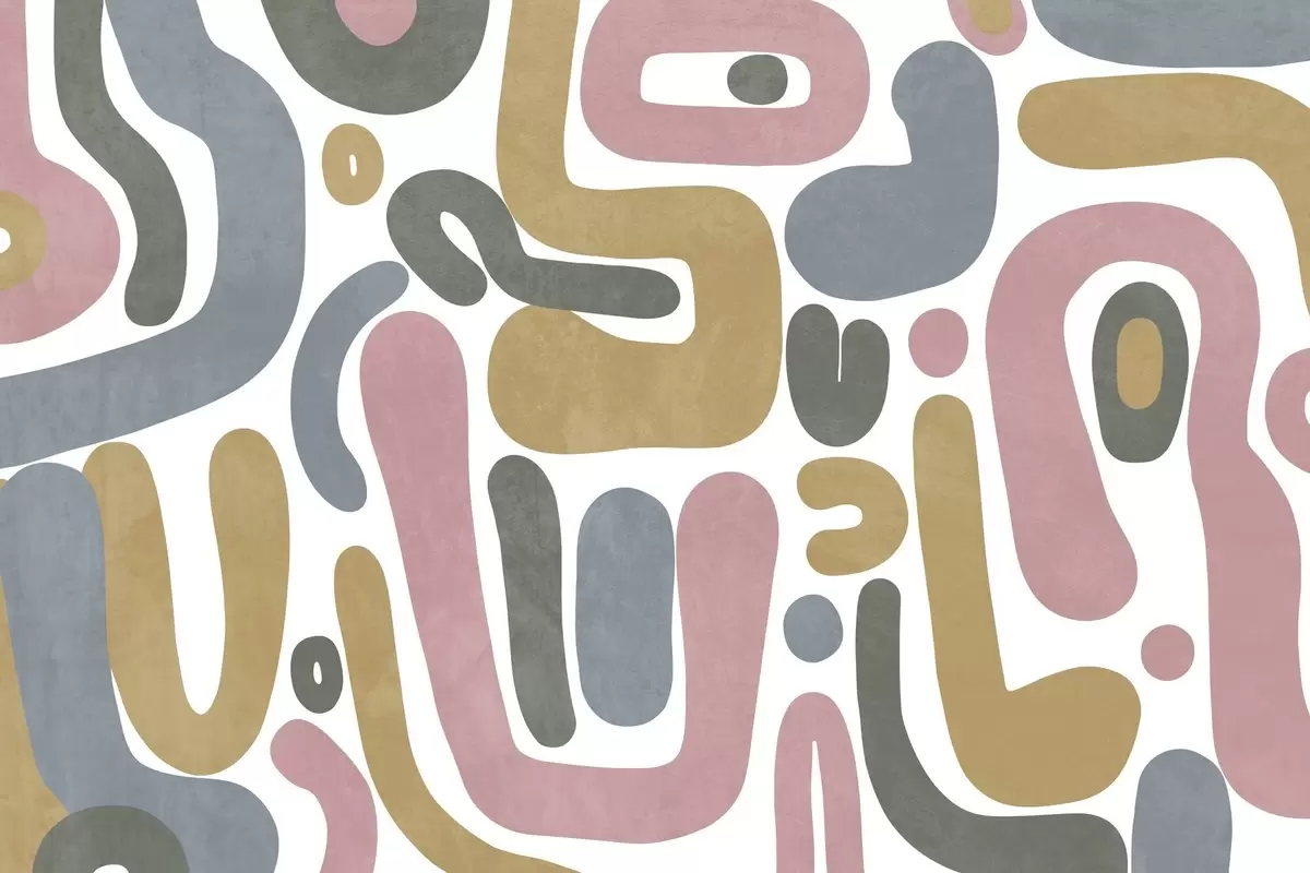 Stenske poslikave Abstraktne teksturirane oblike v pastelno rožnati, pridušeni modri, gorčično rumeni in sivi barvi na belem ozadju sodobna umetnost Št. w09620