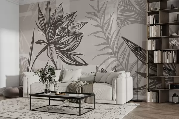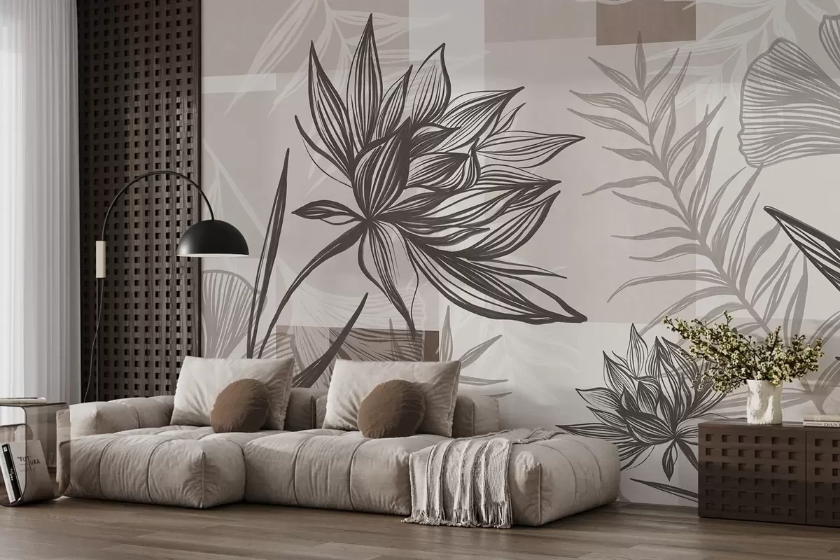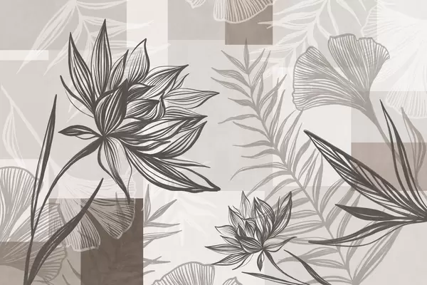 Stenske poslikave Teksturirane stilizirane cvetlice in listi v odtenkih rjave in bež barve, z geometrijskim ozadjem, črtna risba Št. w09629