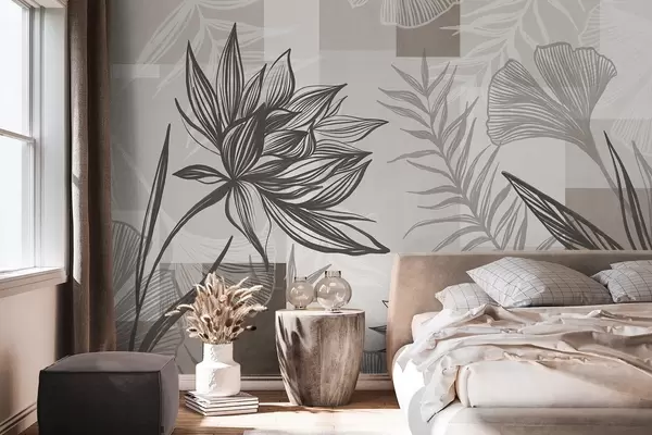 Stenske poslikave Teksturirane stilizirane cvetlice in listi v odtenkih rjave in bež barve, z geometrijskim ozadjem, črtna risba Št. w09629