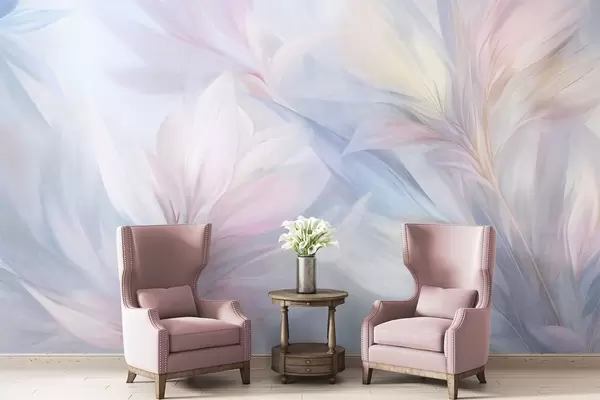 Stenske poslikave Mehka, pastelno obarvana listja in peresa v odtenkih roza, modre in rumene barve, abstraktni in teksturirani potisk Št. w09634