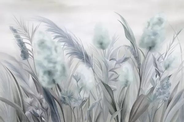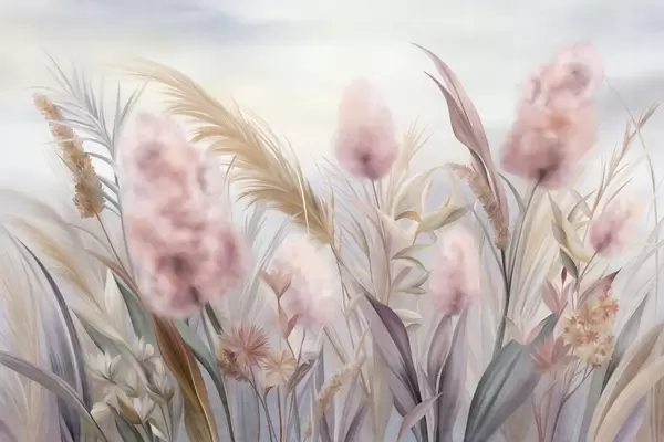 Stenske poslikave Roza in bež pampas trava in druge posušene rože z mehkim, zamegljenim nebom v ozadju Št. w09635