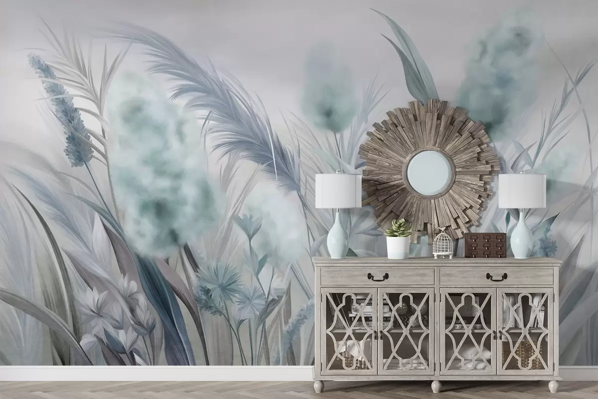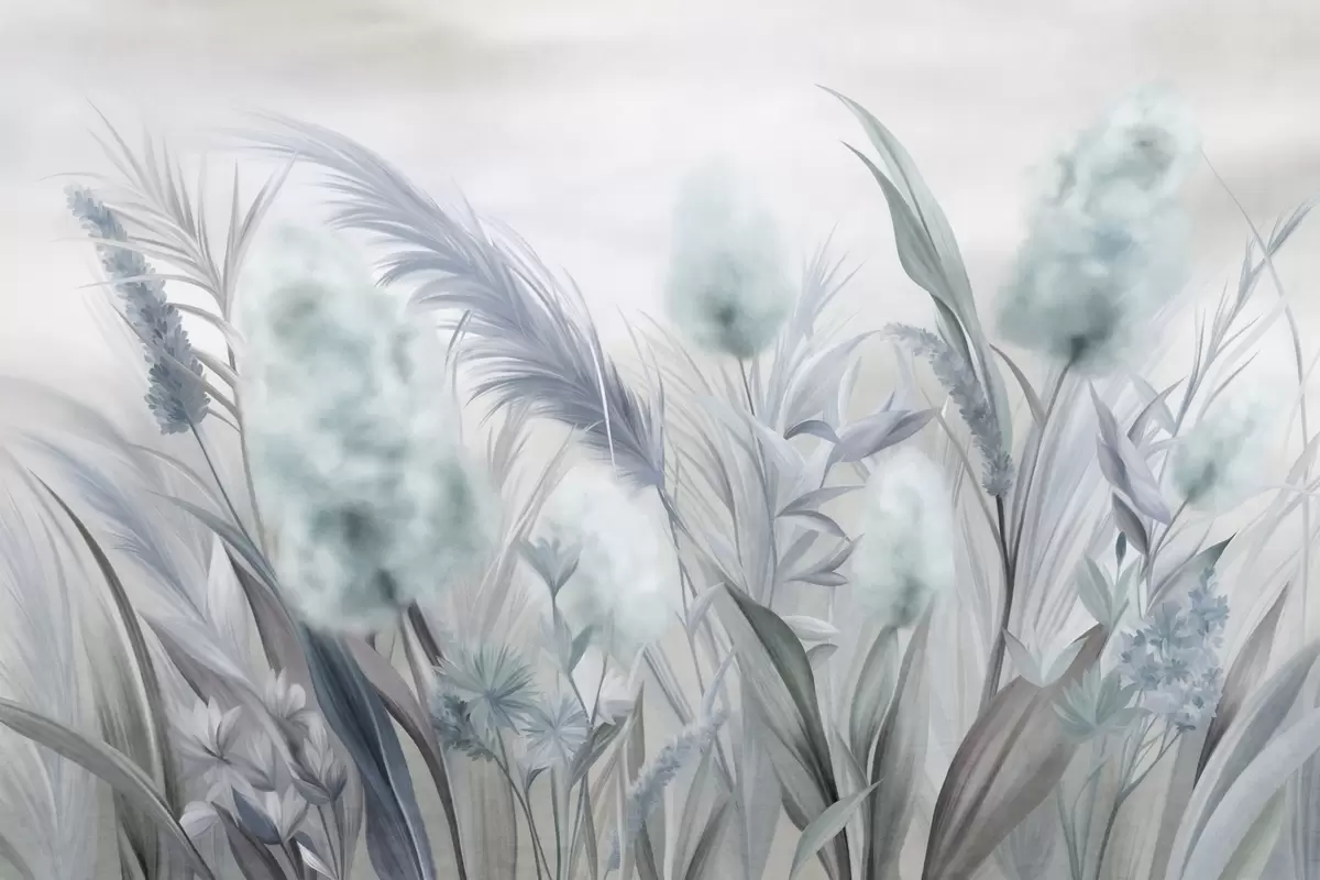 Stenske poslikave Modra in siva trava pampa in druge posušene rože z mehkim, zamegljenim nebom v ozadju Št. w09635v1