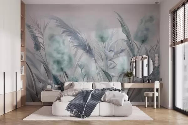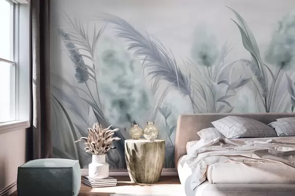 Stenske poslikave Modra in siva trava pampa in druge posušene rože z mehkim, zamegljenim nebom v ozadju Št. w09635v1