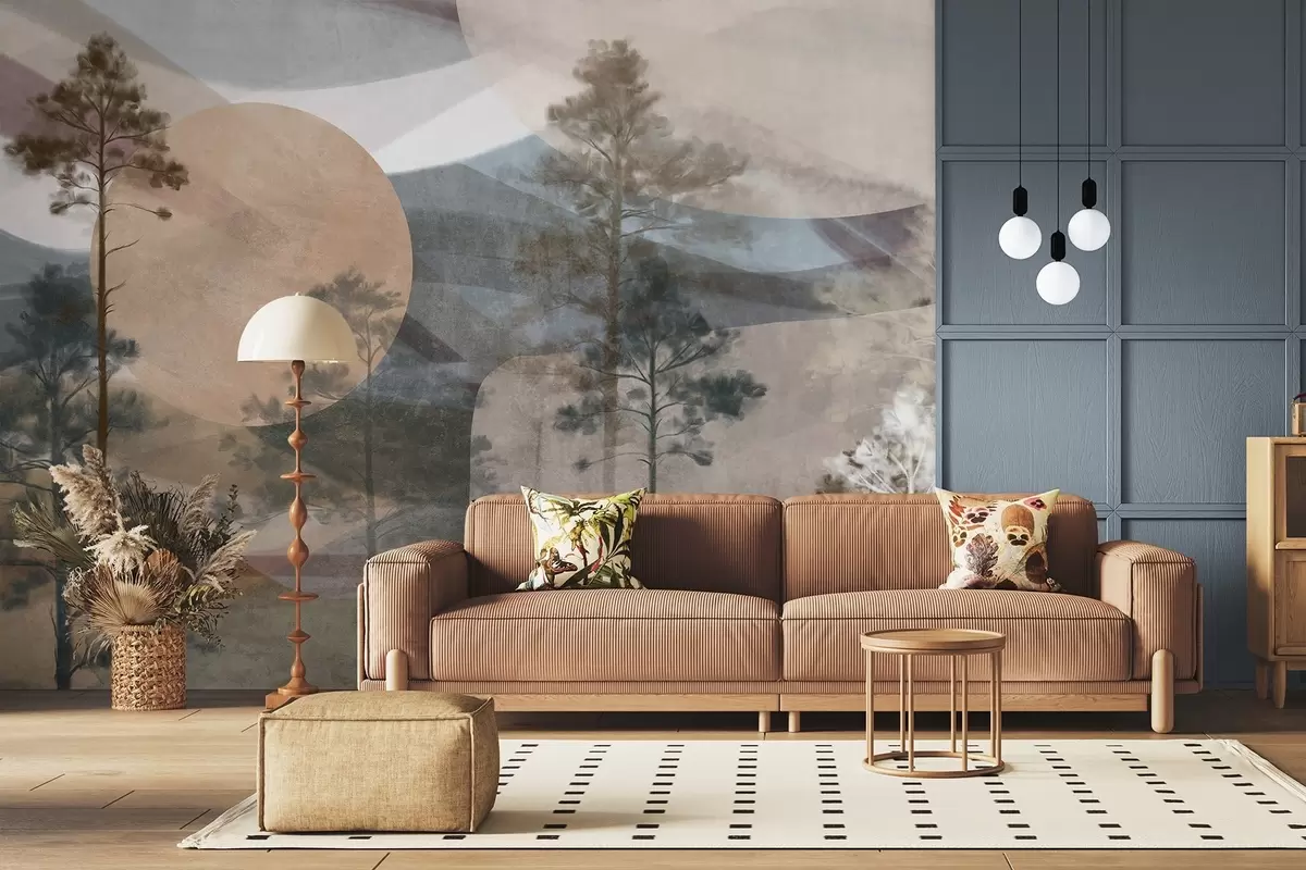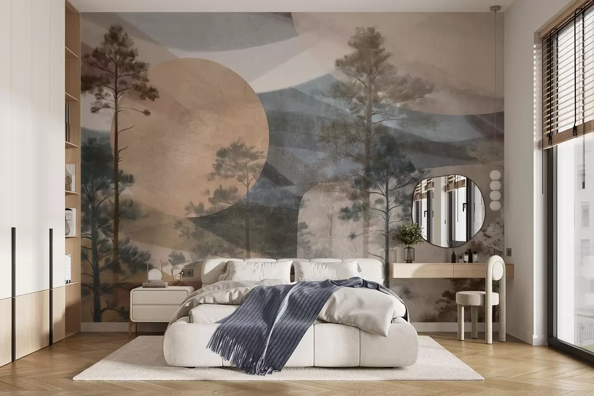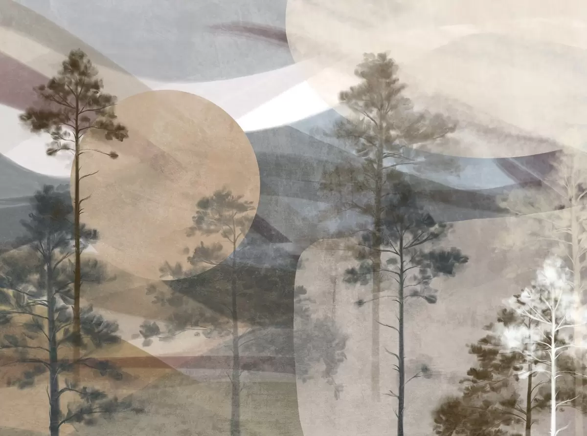 Stenske poslikave Visoke borovce v umirjeni teksturirani pokrajini z abstraktnimi krožnimi oblikami in plastovitimi gorami v zemeljskih tonih Št. w09636