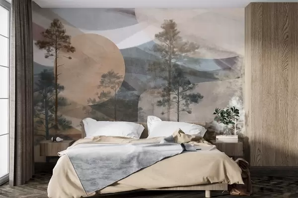 Stenske poslikave Visoke borovce v umirjeni teksturirani pokrajini z abstraktnimi krožnimi oblikami in plastovitimi gorami v zemeljskih tonih Št. w09636