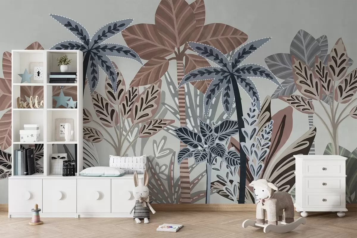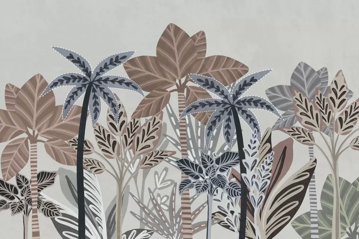 Stenske poslikave Teksturirane tropske rastline in palme v umirjenih barvah v dekorativnem boho slogu na sivem ozadju Št. w09639v1