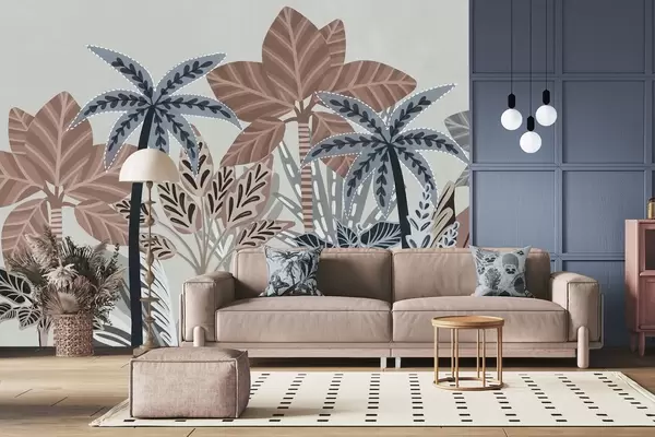 Stenske poslikave Teksturirane tropske rastline in palme v umirjenih barvah v dekorativnem boho slogu na sivem ozadju Št. w09639v1