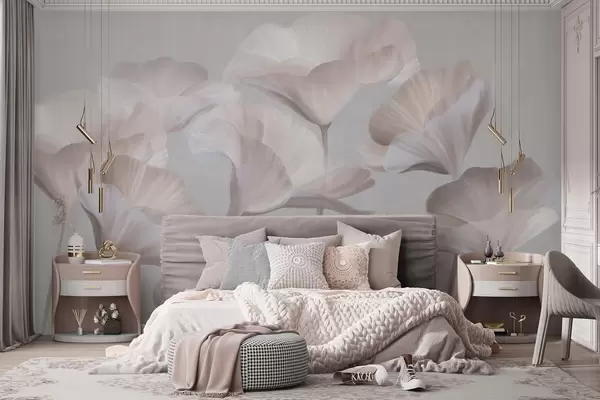 Stenske poslikave Bledo rožnate, prosojne lotusove cvetove z nežnimi cvetnimi listi na nevtralnem sivem ozadju Št. w09640