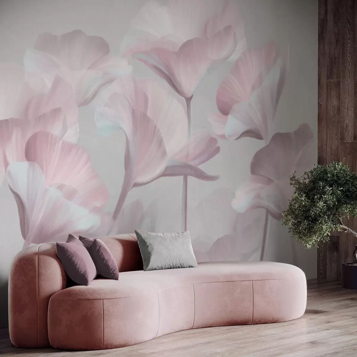 Stenske poslikave Bledo rožnate, teksturirane, prosojne lotusove cvetove z nežnimi cvetnimi listi na nevtralnem sivem ozadju Št. w09640v1