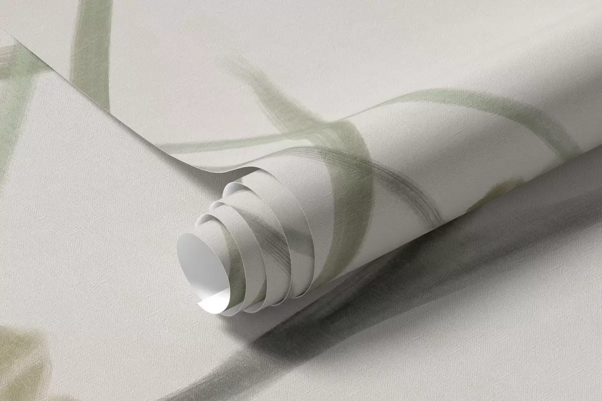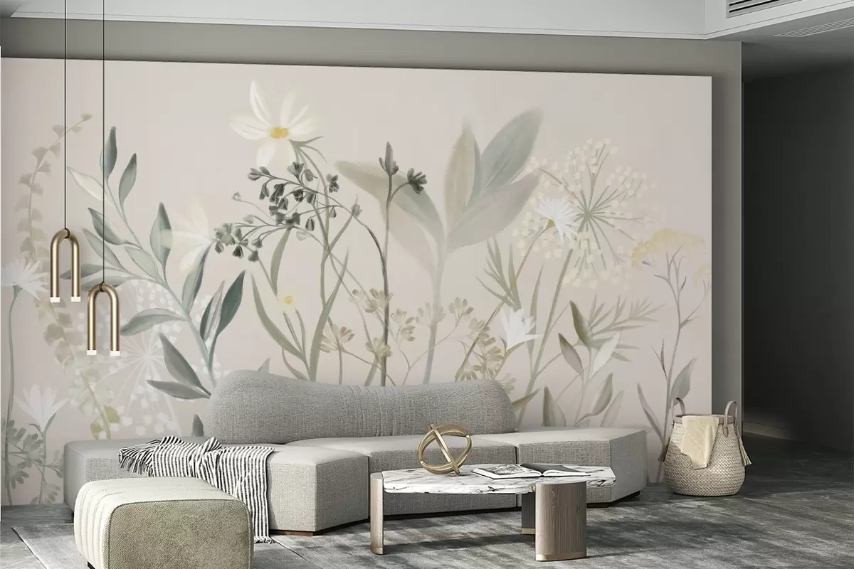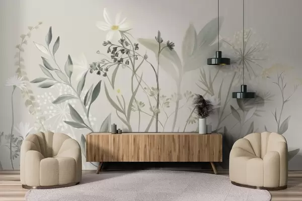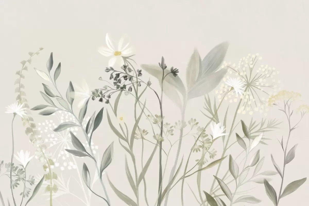 Stenske poslikave Nežne teksturirane divje rože in listje v umirjenih zelenih in kremastih odtenkih na mehkem bežnem ozadju Št. w09641