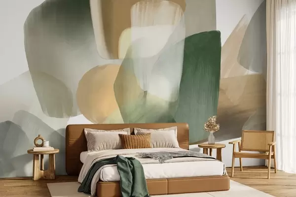 Stenske poslikave Abstraktne teksturirane oblike v umirjenih zelenih in bež barvah, z mehkimi robovi in prekrivajočimi se plastmi. Št. w09642