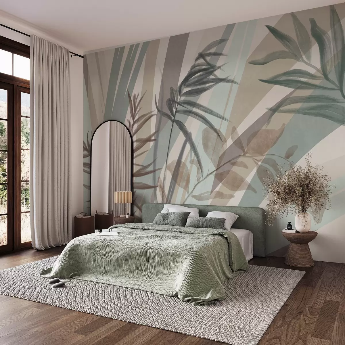 Stenske poslikave Visoka teksturirana trava in listje v umirjenih zemeljskih tonih, z abstraktnimi črtami v ozadju, ki ustvarjajo organski tisk. Št. w09643