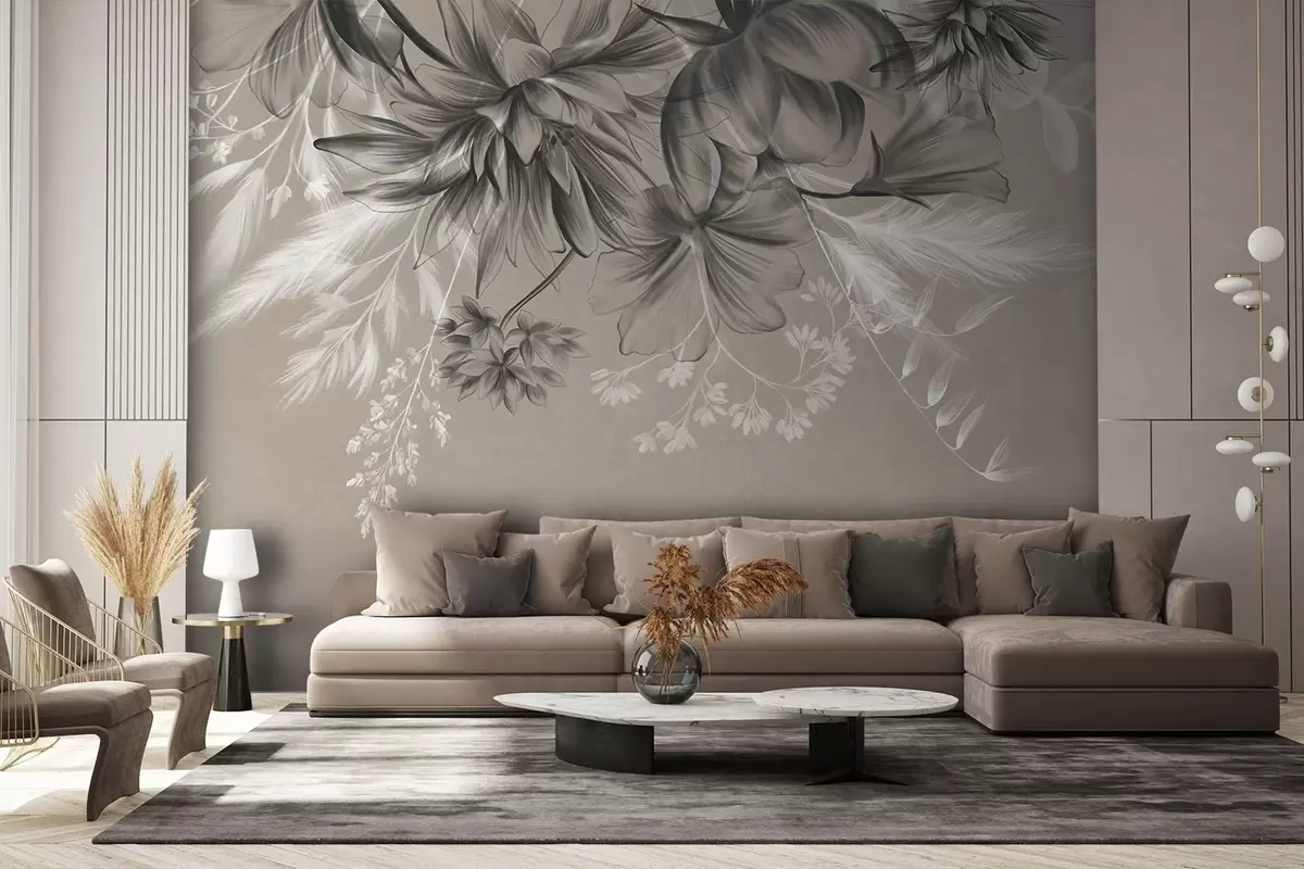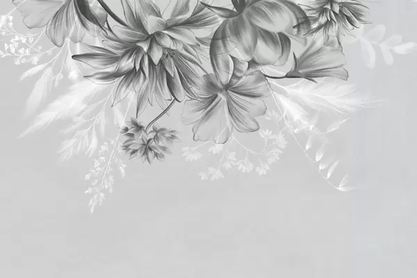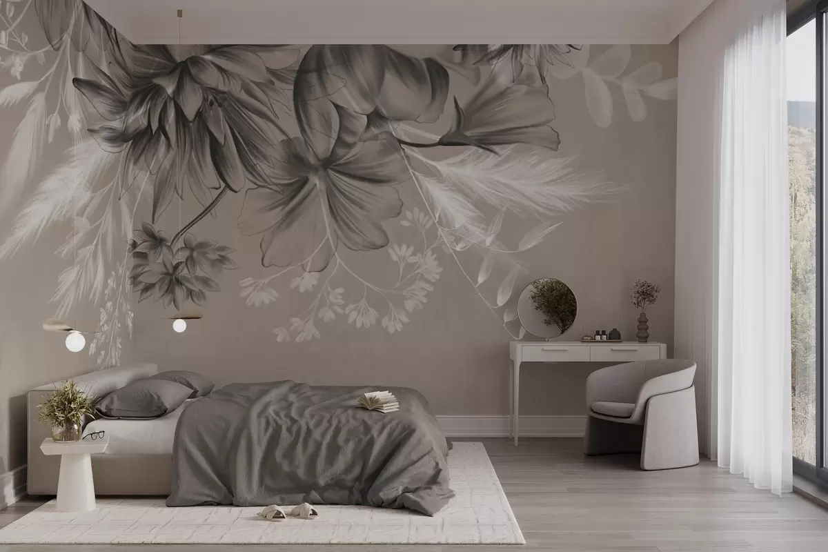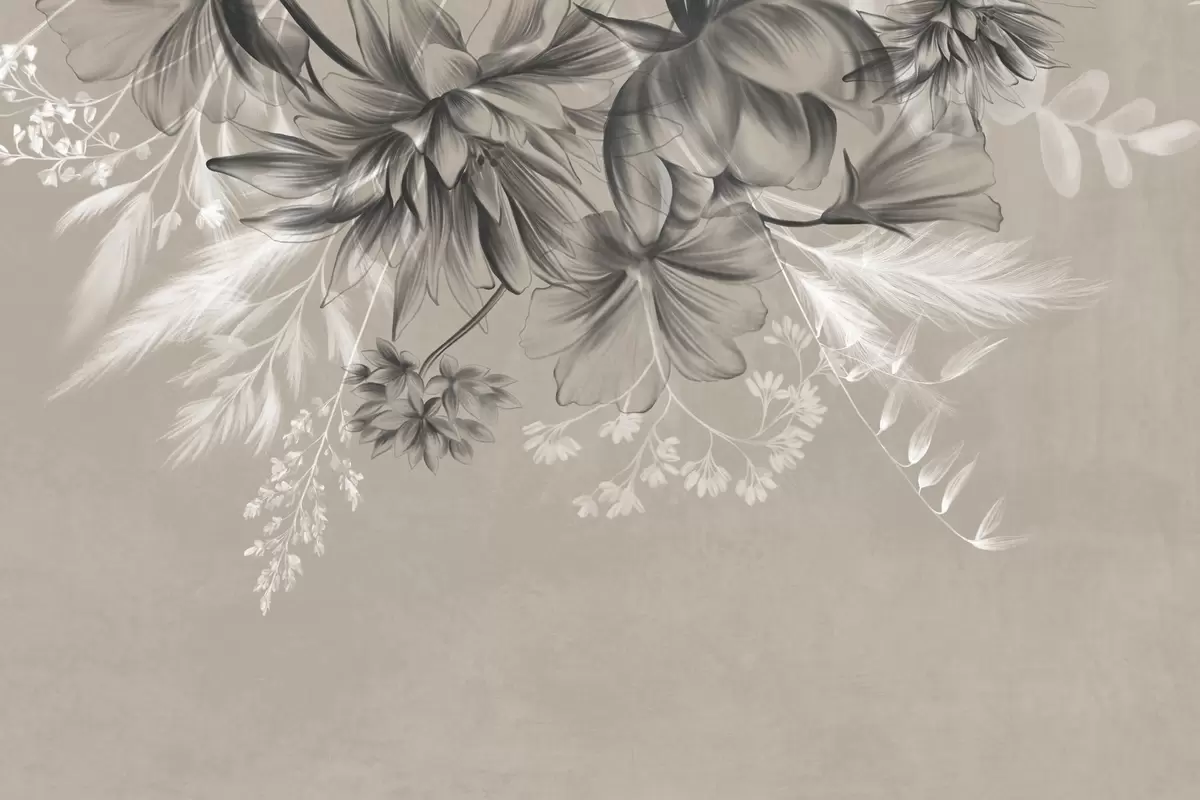 Stenske poslikave Teksturirane cvetlice in praproti v odtenkih temno sive in bele barve na nevtralnem bežnem ozadju v risarskem slogu Št. w09644