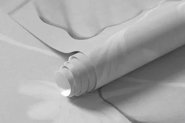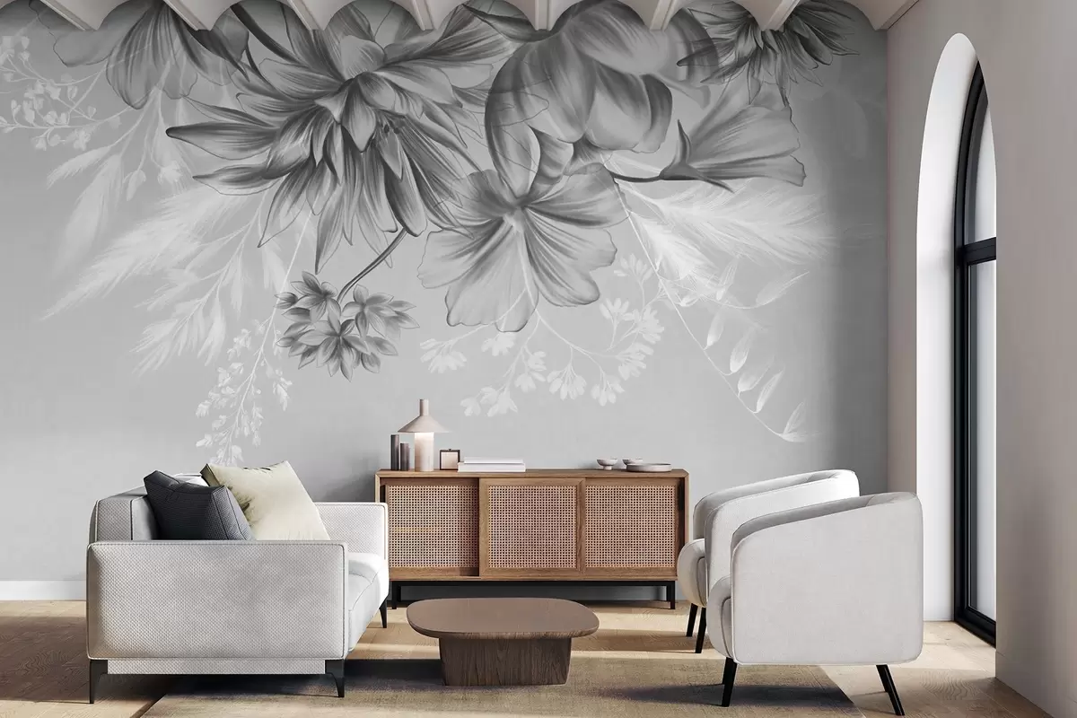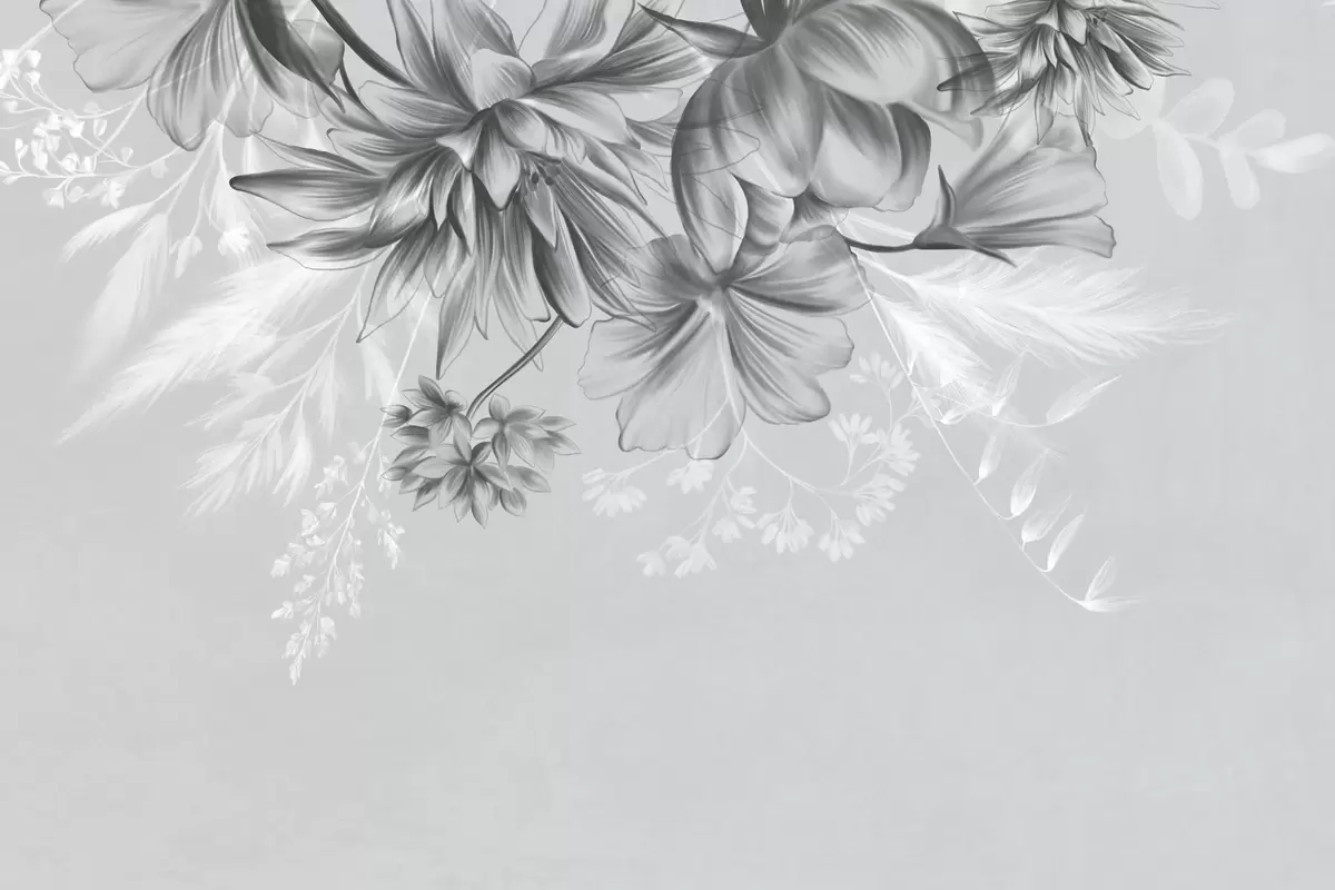 Stenske poslikave Teksturirane cvetlice in praproti v odtenkih temno sive in bele barve na nevtralnem sivem ozadju v risarskem slogu Št. w09644v1