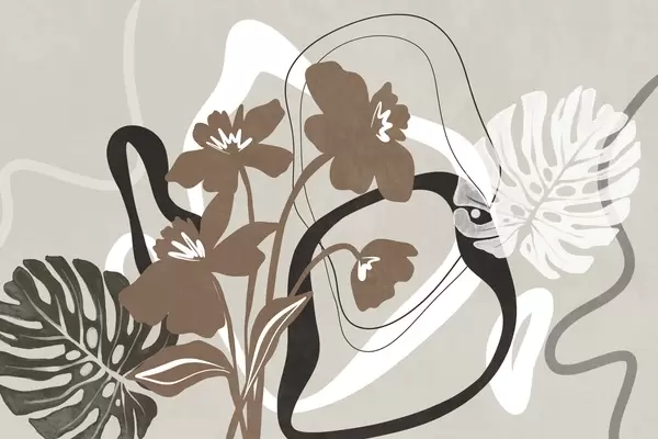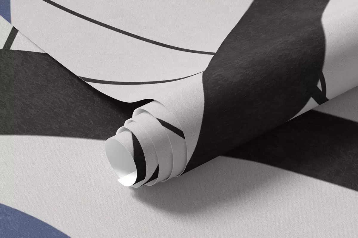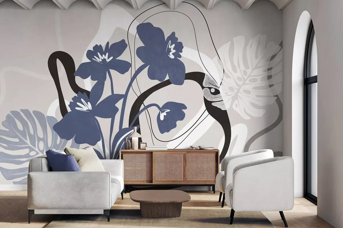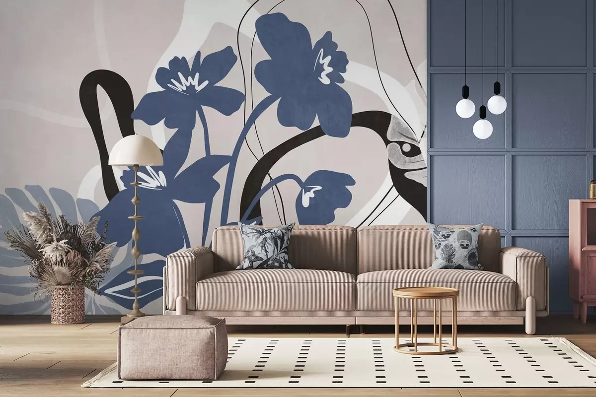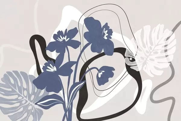 Stenske poslikave Abstraktni teksturirani modri cvetovi z belimi in črnimi oblikami na svetlo bežnem ozadju, minimalistična umetnost Št. w09645