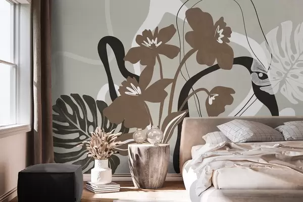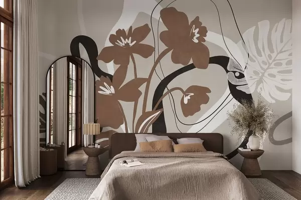 Stenske poslikave Abstraktni teksturirani rjavi cvetovi z belimi in črnimi oblikami na bežnem ozadju, minimalistična umetnost Št. w09645v1