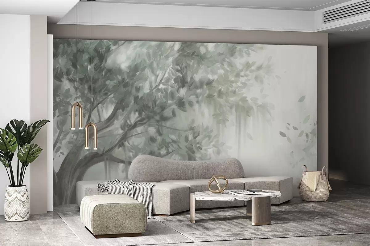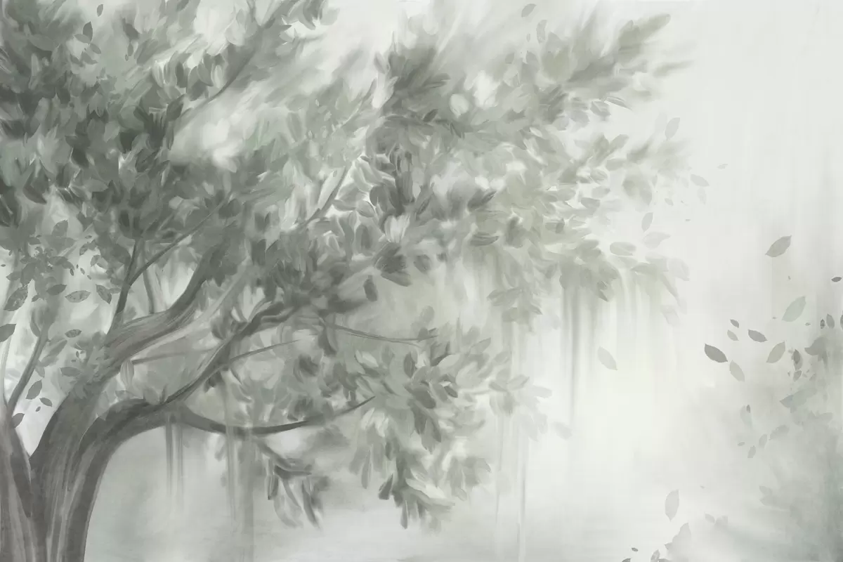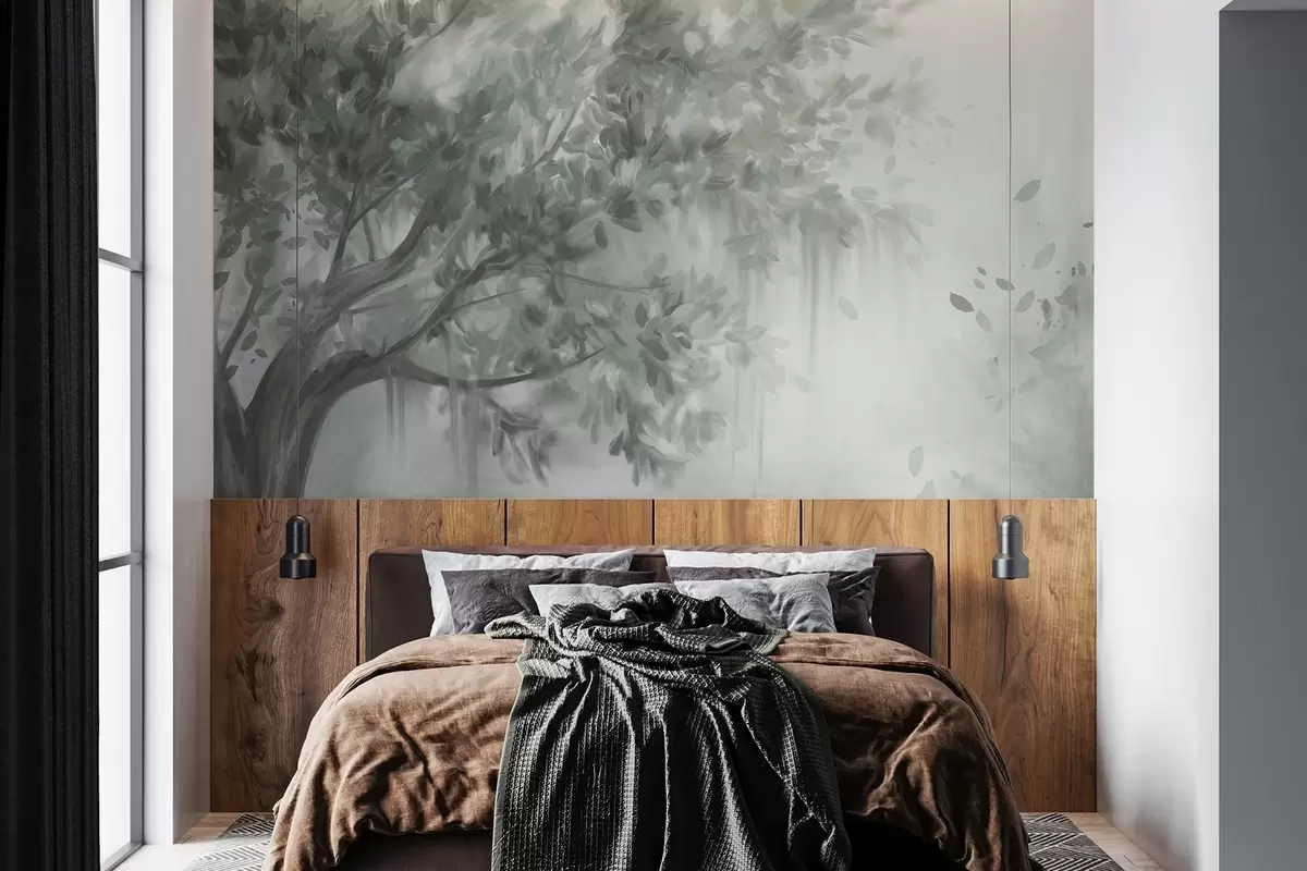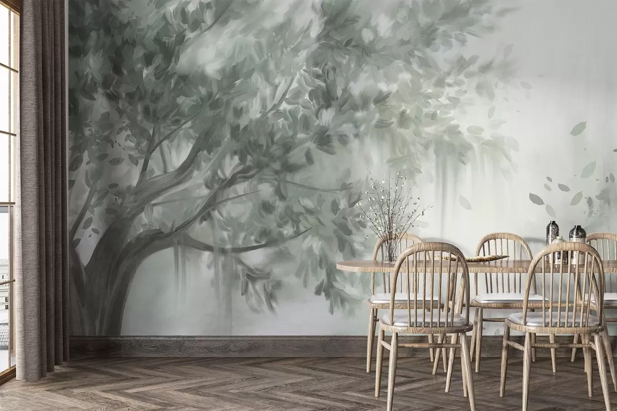 Stenske poslikave Teksturirano drevo z zelenimi listi in vejami, z mehkim, zamegljenim ozadjem Št. w09650v1