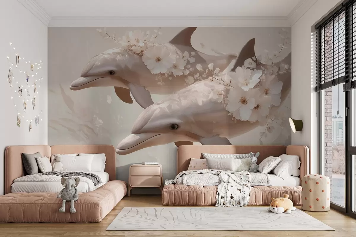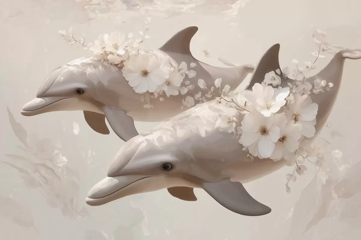 Stenske poslikave Delfini v morju nežnih cvetov in mehke svetlobe Št. w09666