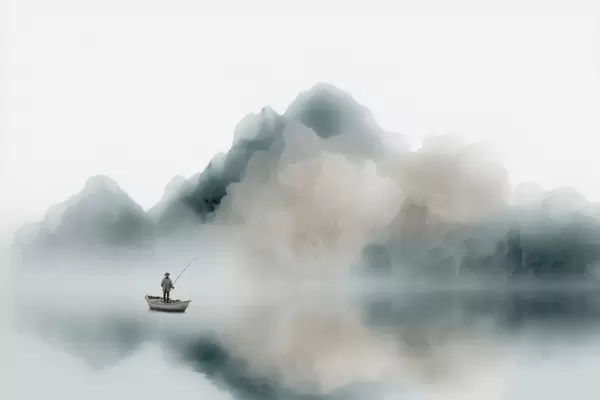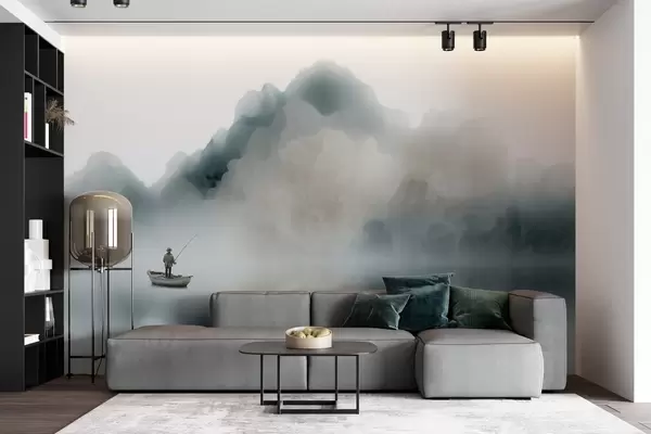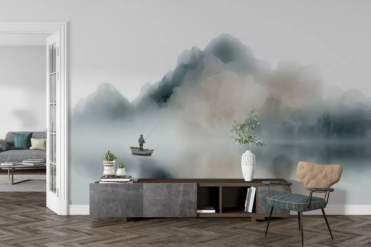Stenske poslikave Gorska pokrajina s čolnom in ribičem, ki se izgubljata v mehki megli Št. w09678