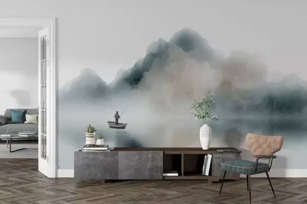 Stenske poslikave Gorska pokrajina s čolnom in ribičem, ki se izgubljata v mehki megli Št. w09678