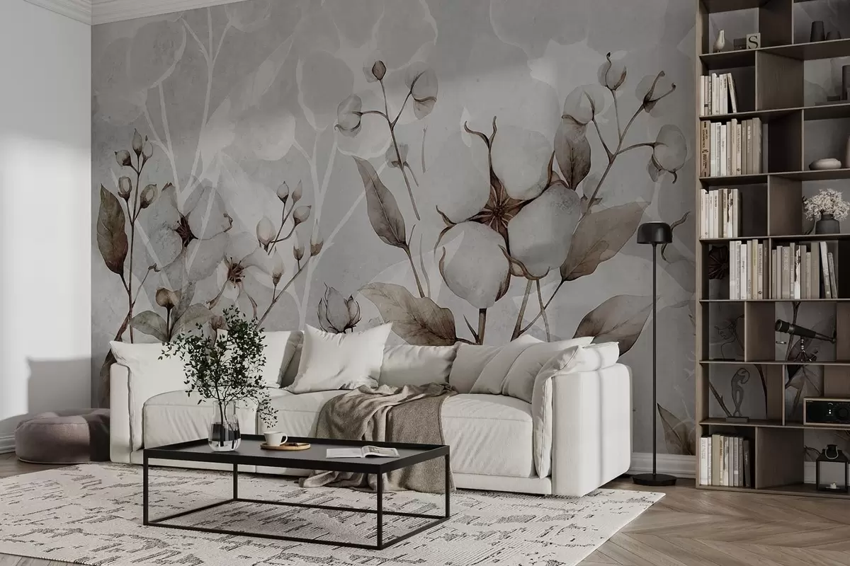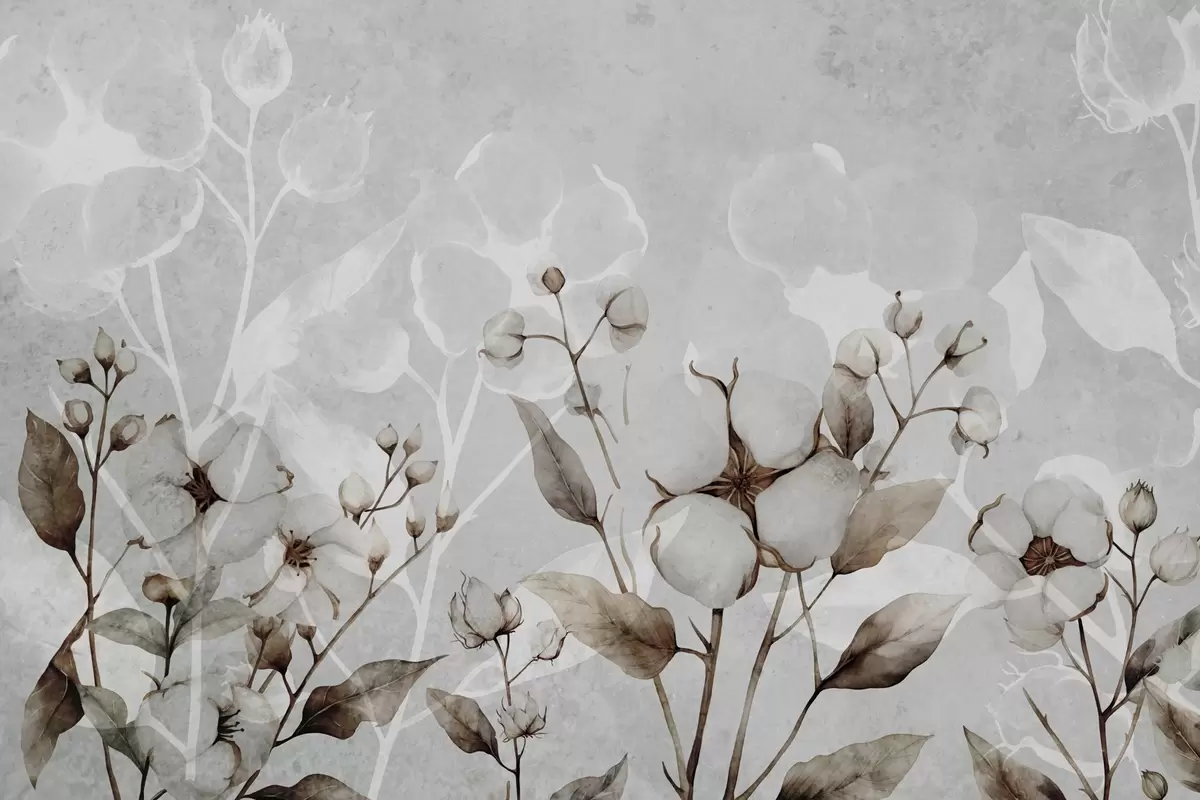 Stenske poslikave Veliki bombažni cvetovi na svetlo sivem ozadju Št. w09691