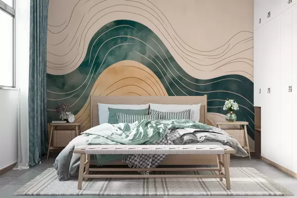 Stenske poslikave Abstraktne valovite črte v naravnih peskovnih in smaragdnih odtenkih Št. w09732