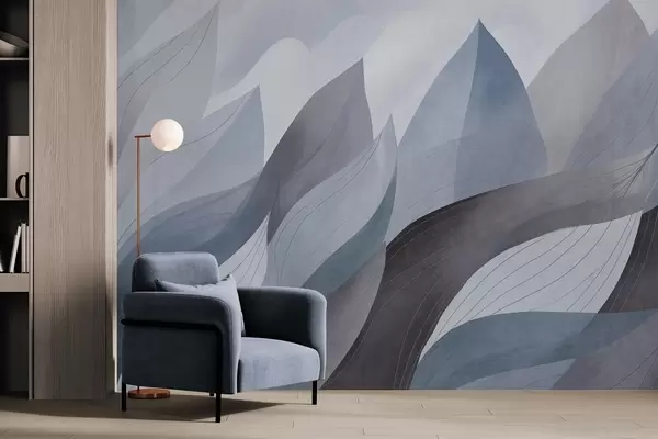 Stenske poslikave Abstraktni listi, pridušeni zemeljski odtenki modre barve z nežnimi podrobnostmi črt, mehka akvarelna tekstura Št. w09736v1