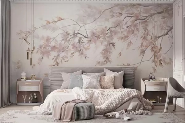 Stenske poslikave Teksturirana pokrajina z vejo češnjevega cvetja, rožnatimi listi in mehkim, meglenim ozadjem Št. w09743